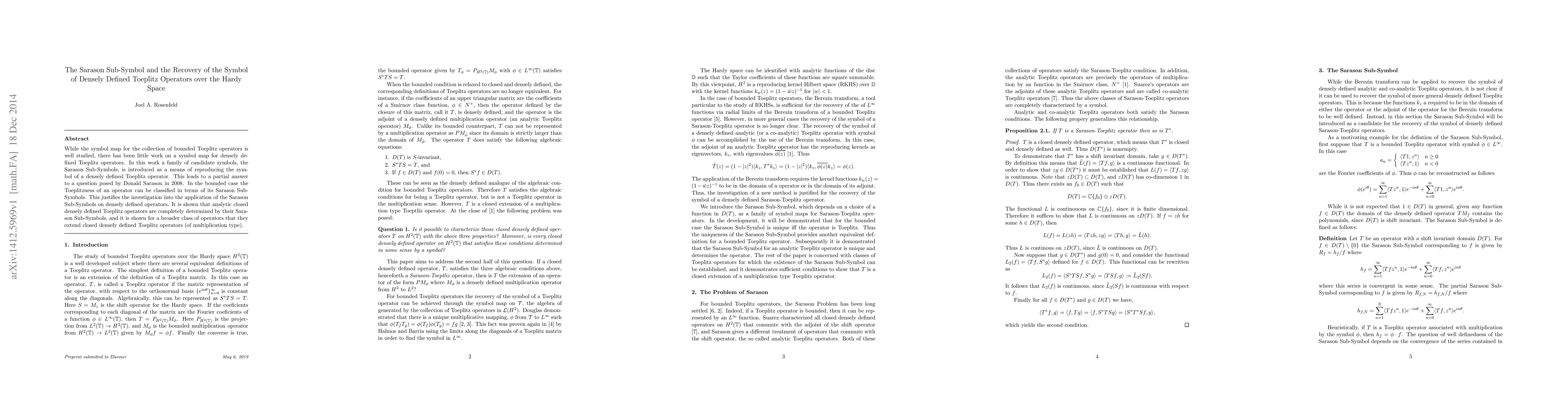 While the symbol map for the collection of bounded Toeplitz operators is well studied, there has been little work on a symbol map for densely defined Toeplitz operators. In this work a family of candidate symbols, the Sarason Sub-Symbols, is introduced as a means of reproducing the symbol of a densely defined Toeplitz operator. This leads to a partial answer to a question posed by Donald Sarason in 2008. In the bounded case the Toeplitzness of an operator can be classified in terms of its Sarason Sub-Symbols. This justifies the investigation into the application of the Sarason Sub-Symbols on densely defined operators. It is shown that analytic closed densely defined Toeplitz operators are completely determined by their Sarason Sub-Symbols, and it is shown for a broader class of operators that they extend closed densely defined Toeplitz operators (of multiplication type).