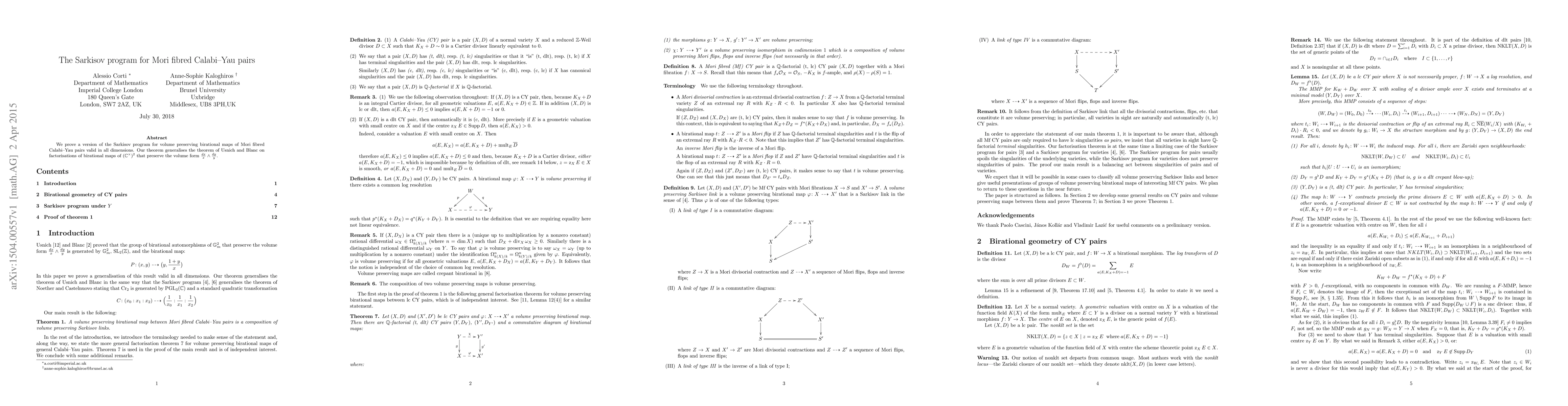 We prove a version of the Sarkisov program for volume preserving birational maps of Mori fibred Calabi-Yau pairs valid in all dimensions. Our theorem generalises the theorem of Usnich and Blanc on factorisations of birational maps of the 2-dimensional torus that preserve the canonical volume form.