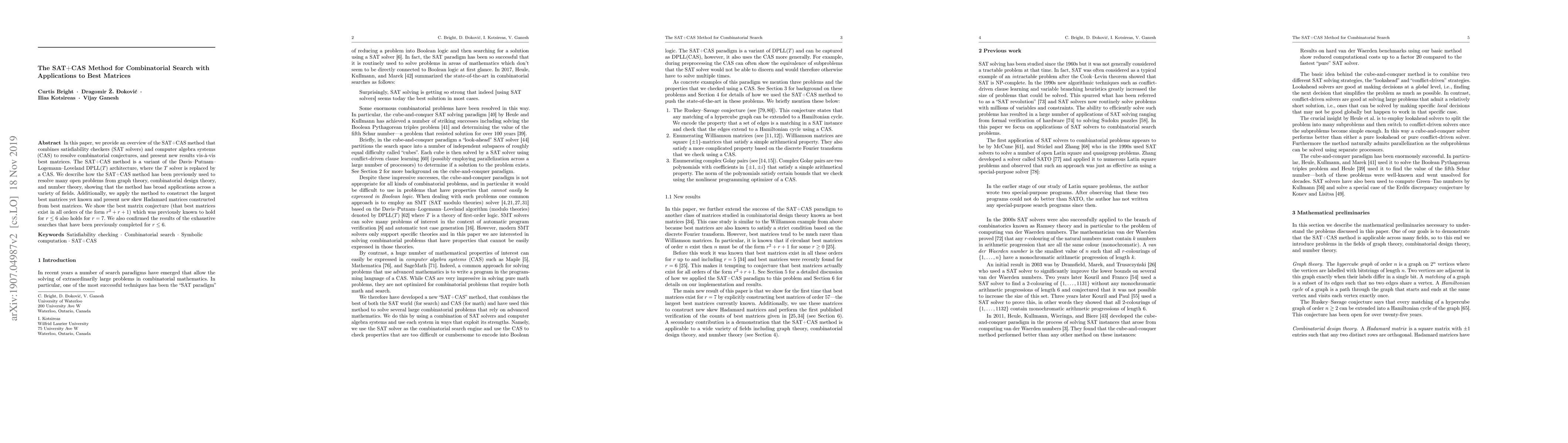 A new method combining SAT solvers and CAS resolves open problems in graph theory, combinatorial design theory, and number theory, including the construction of largest known best matrices and a proof for $r=7$.