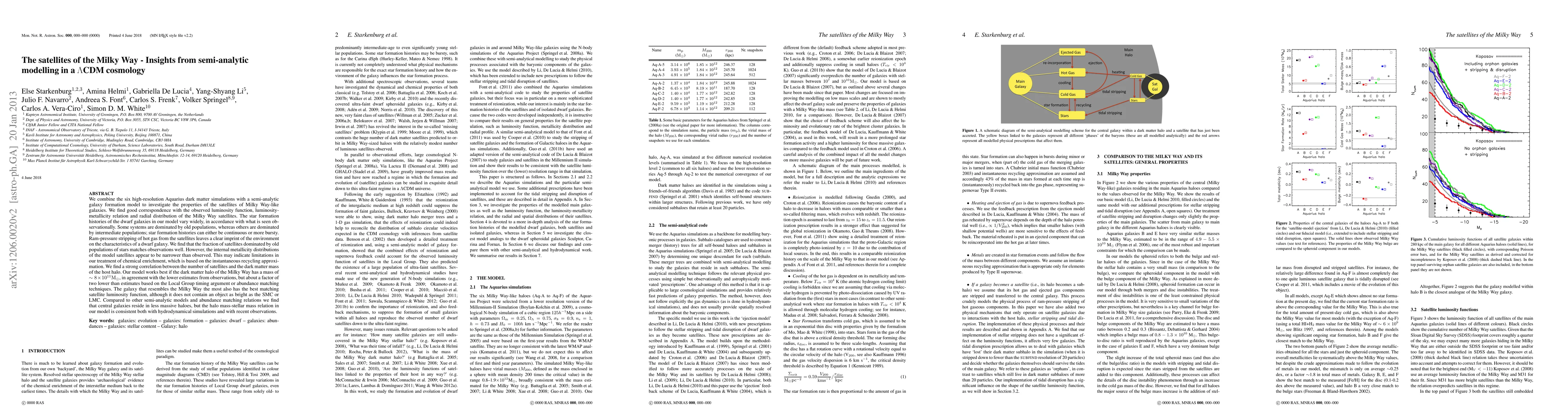 This study combines high-resolution dark matter simulations with a semi-analytic galaxy formation model to explore the properties of Milky Way-like galaxies' satellites, finding good agreement with observed luminosity and radial distribution. However, the model's internal metallicity distributions are narrower than observed, suggesting limitations in chemical enrichment treatment.