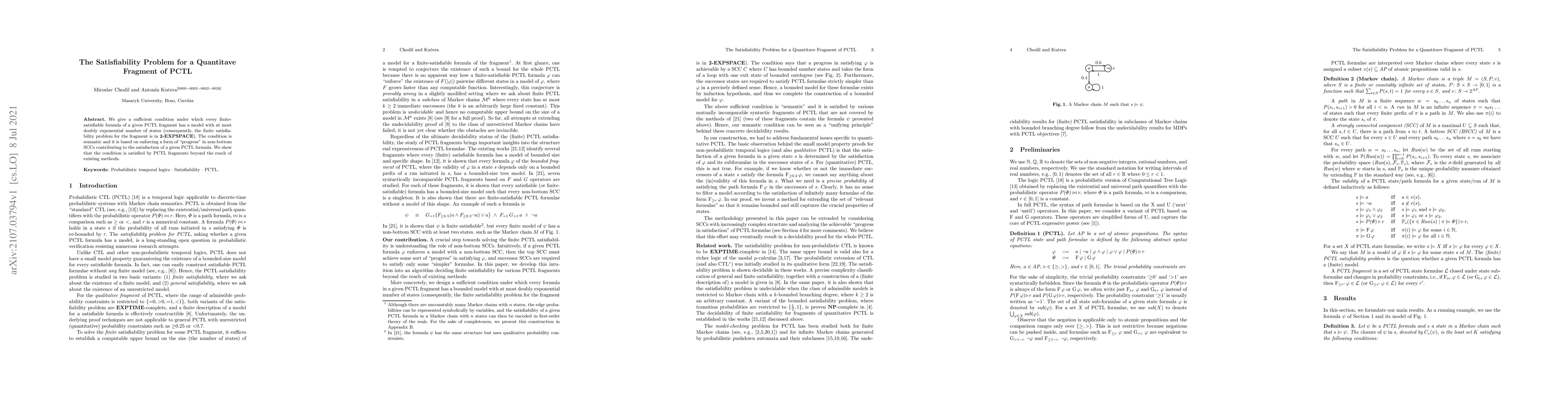 This paper presents a sufficient condition ensuring that finite-satisfiable formulas in a specific PCTL fragment have models with doubly exponential state sizes, placing the finite satisfiability problem within 2-EXPSPACE. The condition relies on a semantic "progress" requirement in non-bottom strongly connected components.