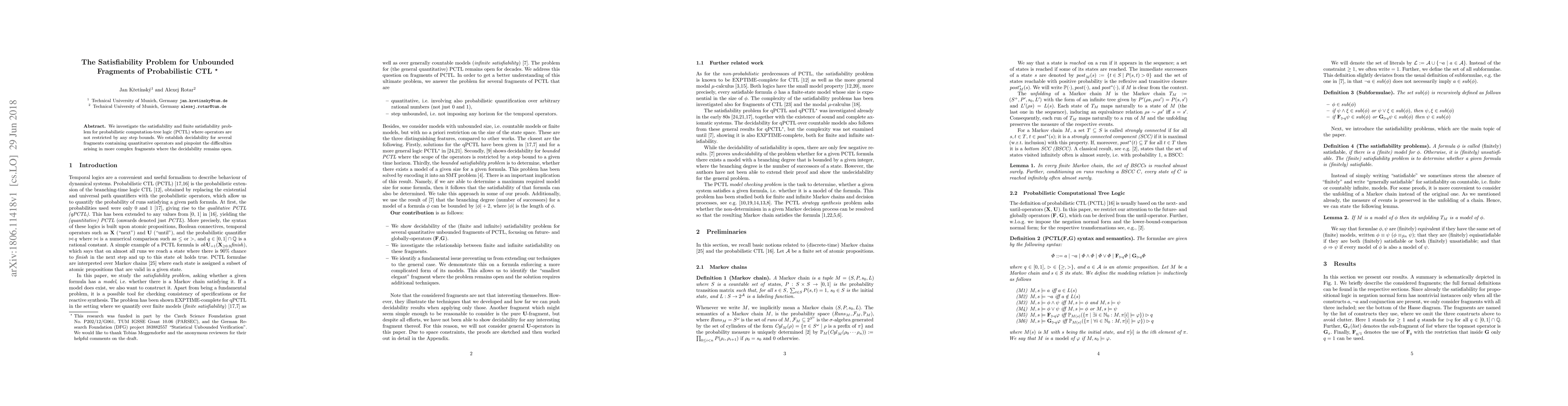 This paper explores the satisfiability problem for unbounded fragments of probabilistic computation-tree logic (PCTL), establishing decidability for several fragments while highlighting the challenges in more complex fragments where decidability remains unresolved.