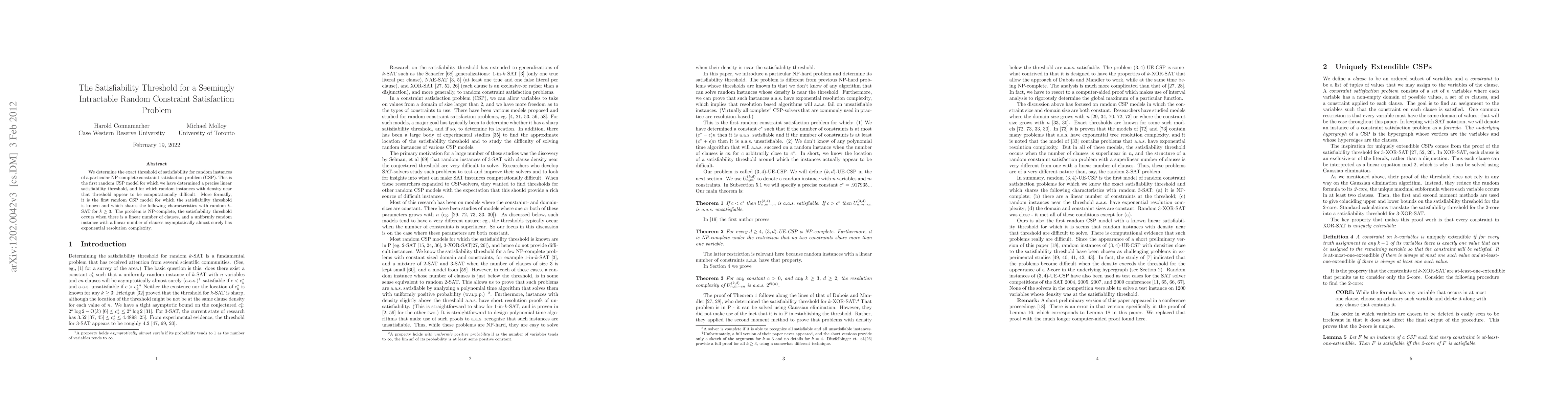 This paper identifies the precise satisfiability threshold for a novel random NP-complete constraint satisfaction problem, revealing that instances near this threshold are computationally challenging. This is the first such model where the exact threshold is known and shares key characteristics with random k-SAT for k ≥ 3.