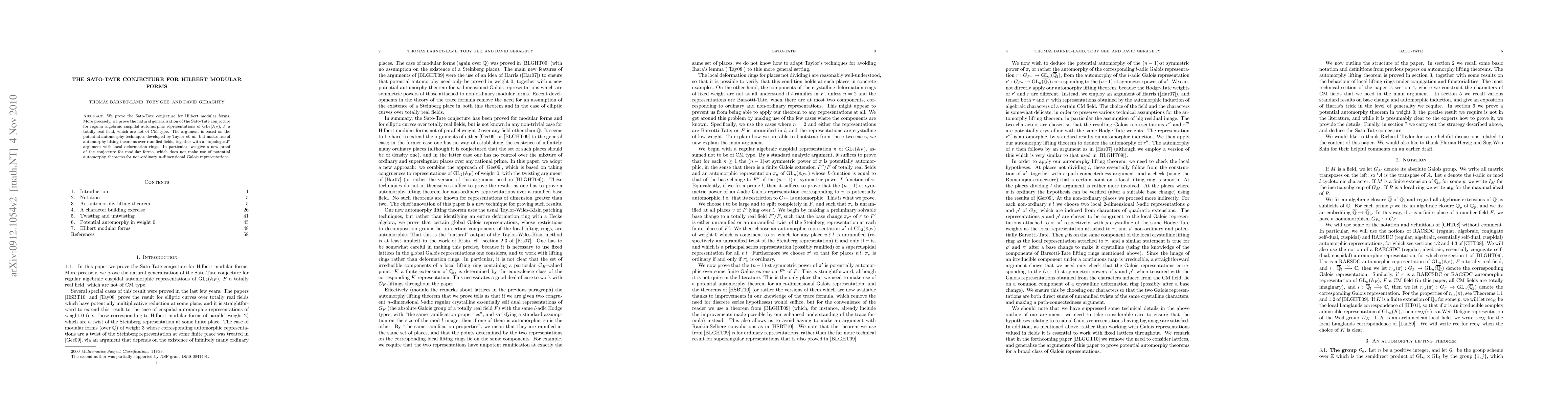 The paper proves the Sato-Tate conjecture for Hilbert modular forms, specifically for non-CM type regular algebraic cuspidal automorphic representations of $\GL_2(\A_F)$. The proof leverages automorphy lifting theorems over ramified fields and employs a novel 'topological' argument involving local deformation rings.
