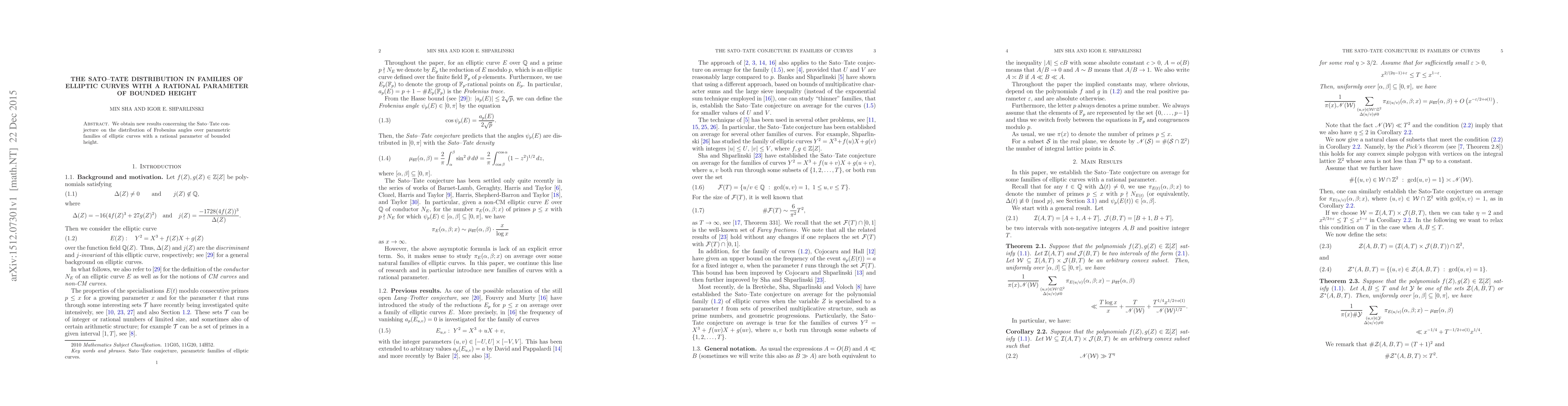 Summary: This paper provides new insights into the Sato-Tate conjecture regarding the distribution of Frobenius angles across families of elliptic curves with rational parameters constrained by bounded height. It advances understanding in arithmetic geometry and number theory.