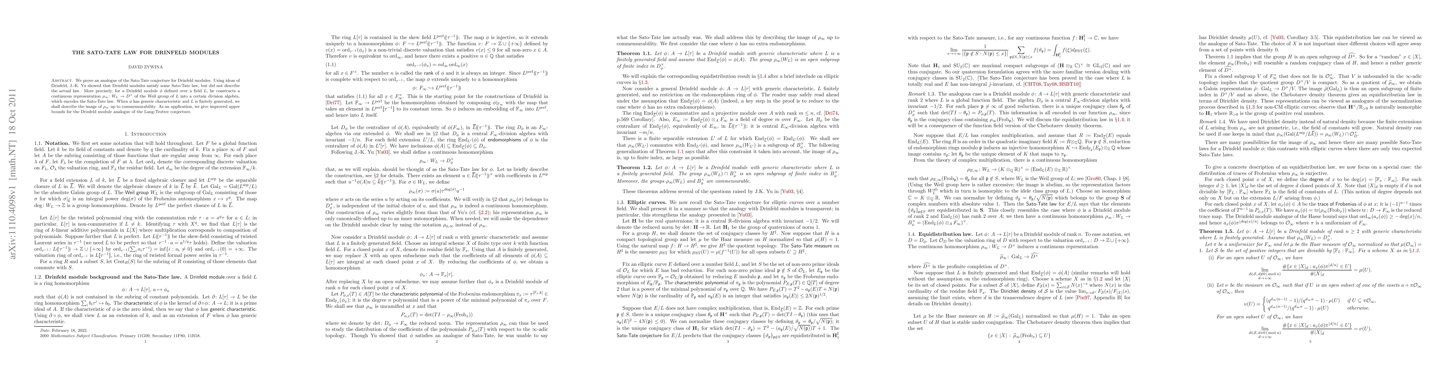 This paper proves an analogue of the Sato-Tate conjecture for Drinfeld modules by describing the image of a constructed representation, providing improved bounds for the Lang-Trotter conjecture analogue in this context.