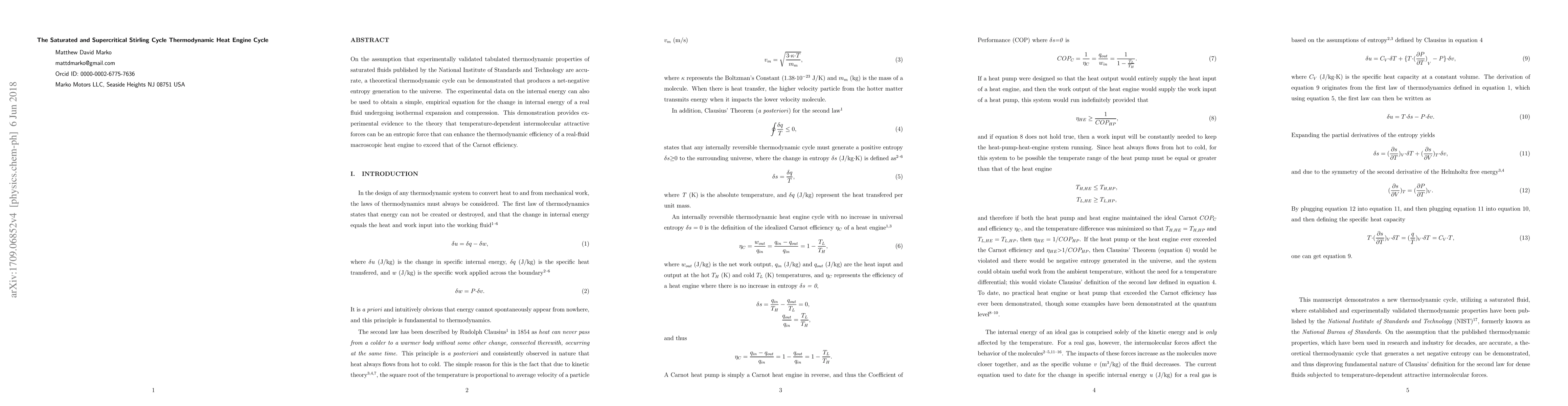 This paper demonstrates a theoretical thermodynamic cycle for a Stirling Cycle heat engine that achieves net-negative entropy generation, suggesting enhanced efficiency beyond Carnot limits, supported by empirical equations derived from experimental data on fluid internal energy.