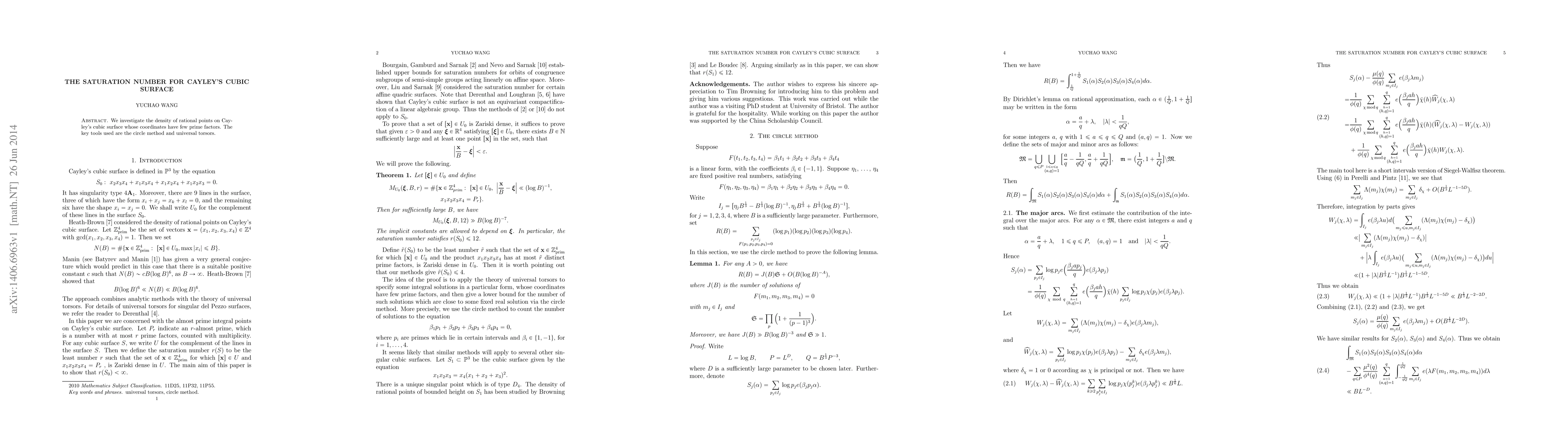 Summary: This paper explores the density of rational points on Cayley's cubic surface with coordinates having limited prime factors, employing the circle method and universal torsors as primary analytical tools.