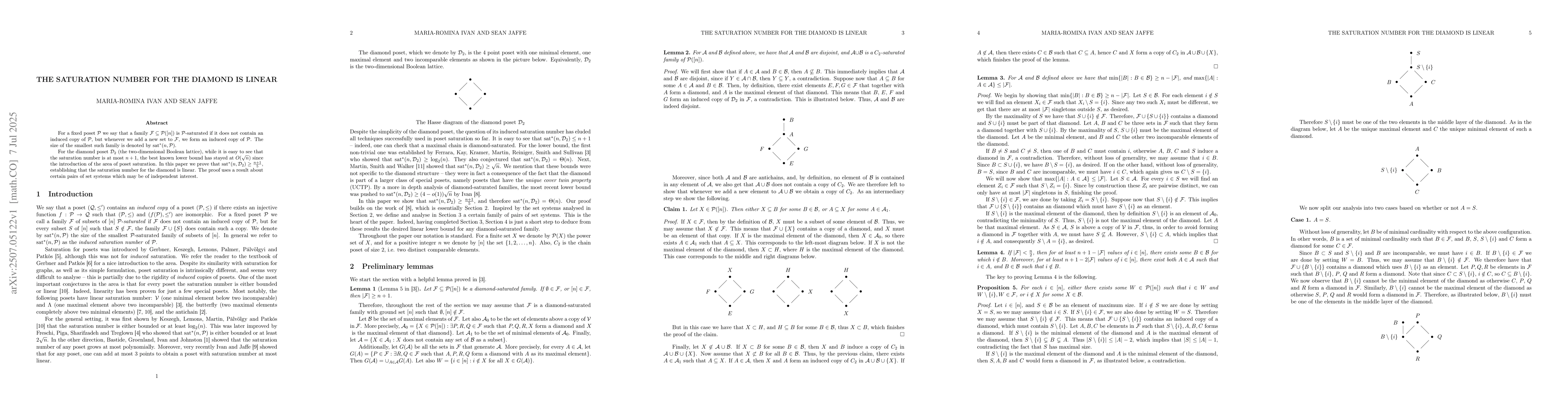 For a fixed poset $\mathcal P$ we say that a family $\mathcal F\subseteq\mathcal P([n])$ is $\mathcal P$-saturated if it does not contain an induced copy of $\mathcal P$, but whenever we add a new set to $\mathcal F$, we form an induced copy of $\mathcal P$. The size of the smallest such family is denoted by $\text{sat}^*(n, \mathcal P)$.\par For the diamond poset $\mathcal D_2$ (the two-dimensional Boolean lattice), while it is easy to see that the saturation number is at most $n+1$, the best known lower bound has stayed at $O(\sqrt n)$ since the introduction of the area of poset saturation. In this paper we prove that $\text{sat}^*(n, \mathcal D_2)\geq \frac{n+1}{5}$, establishing that the saturation number for the diamond is linear. The proof uses a result about certain pairs of set systems which may be of independent interest.