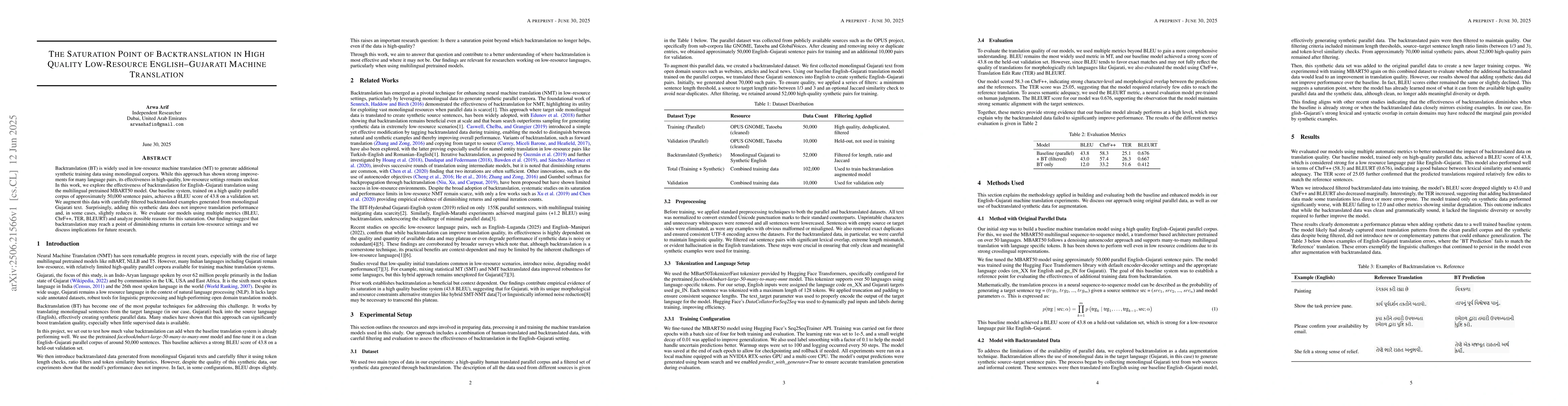 Backtranslation BT is widely used in low resource machine translation MT to generate additional synthetic training data using monolingual corpora. While this approach has shown strong improvements for many language pairs, its effectiveness in high quality, low resource settings remains unclear. In this work, we explore the effectiveness of backtranslation for English Gujarati translation using the multilingual pretrained MBART50 model. Our baseline system, trained on a high quality parallel corpus of approximately 50,000 sentence pairs, achieves a BLEU score of 43.8 on a validation set. We augment this data with carefully filtered backtranslated examples generated from monolingual Gujarati text. Surprisingly, adding this synthetic data does not improve translation performance and, in some cases, slightly reduces it. We evaluate our models using multiple metrics like BLEU, ChrF++, TER, BLEURT and analyze possible reasons for this saturation. Our findings suggest that backtranslation may reach a point of diminishing returns in certain low-resource settings and we discuss implications for future research.