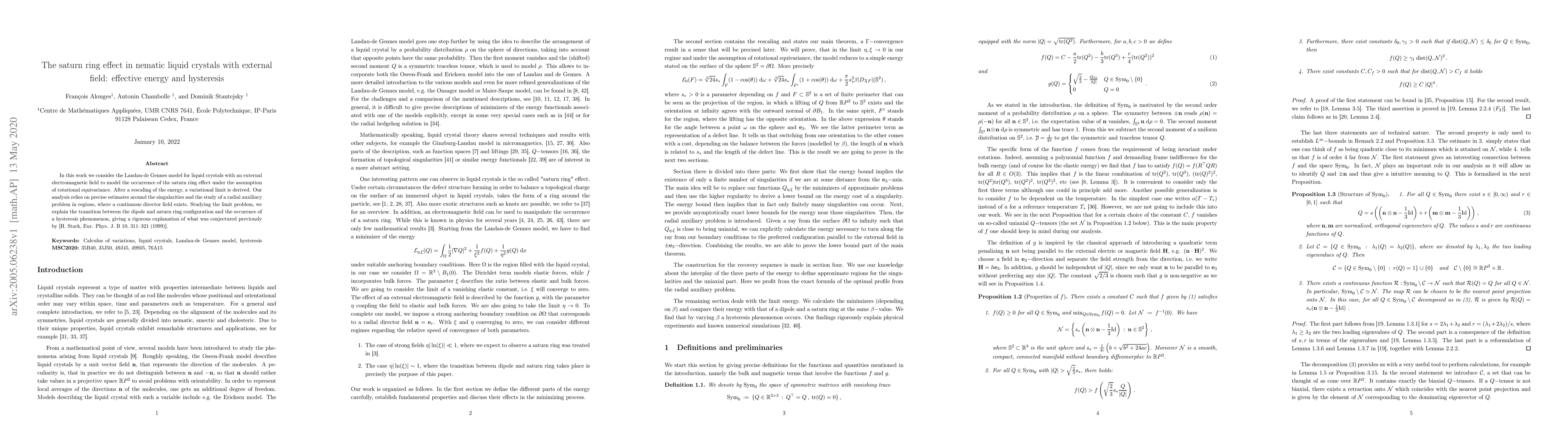 In this work we consider the Landau-de Gennes model for liquid crystals with an external electromagnetic field to model the occurrence of the saturn ring effect under the assumption of rotational equivariance. After a rescaling of the energy, a variational limit is derived. Our analysis relies on precise estimates around the singularities and the study of a radial auxiliary problem in regions, where a continuous director field exists. Studying the limit problem, we explain the transition between the dipole and saturn ring configuration and the occurrence of a hysteresis phenomenon, giving a rigorous explanation of what was conjectured previously by [H. Stark, Eur. Phys. J. B 10, 311-321 (1999)].