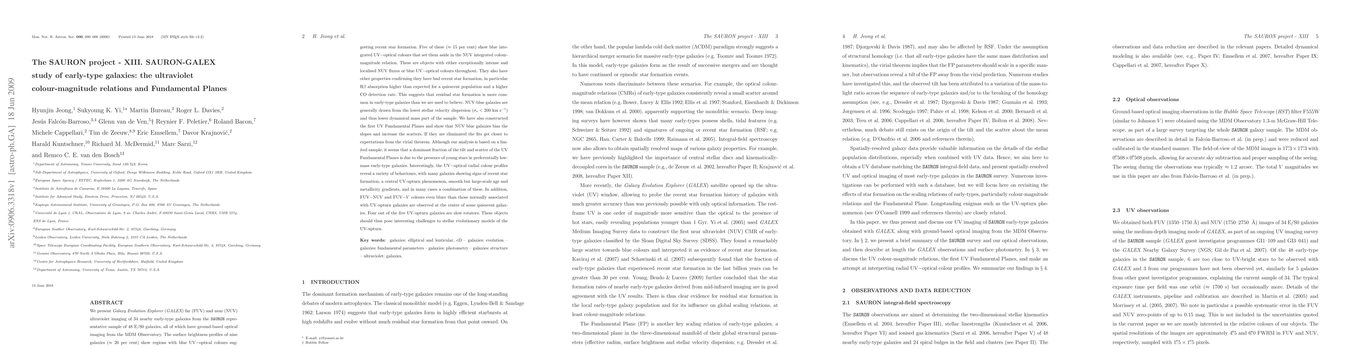 This study combines GALEX ultraviolet imaging with optical data from the SAURON project to investigate early-type galaxies, revealing that galaxies with blue UV-optical colors suggest recent star formation. The presence of young stars in lower-mass galaxies skews the UV Fundamental Planes, indicating a significant contribution to the tilt and scatter in these planes.