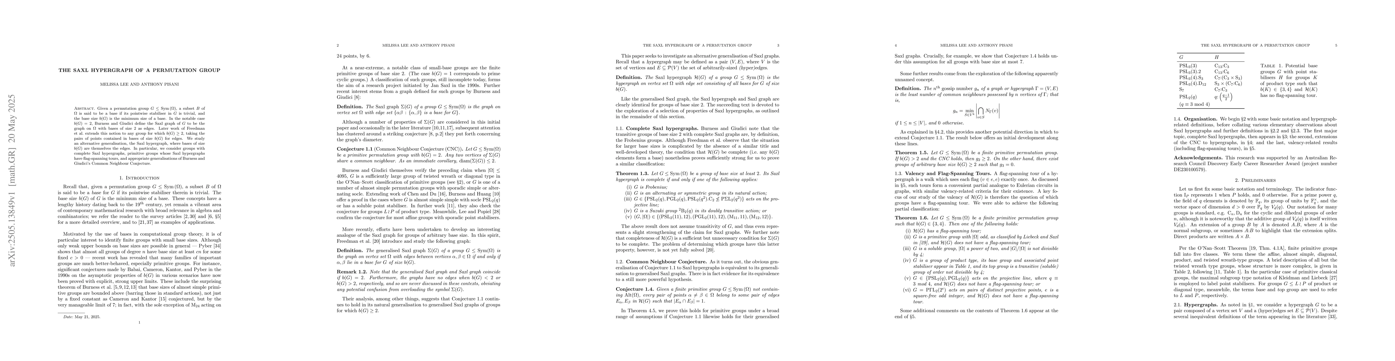 This paper studies a new graph structure called the Saxl hypergraph, which is used to generalize Burness and Giudici's work on permutation groups. It focuses on complete Saxl hypergraphs, primitive groups with flag-spanning tours, and implications for the Common Neighbour Conjecture.