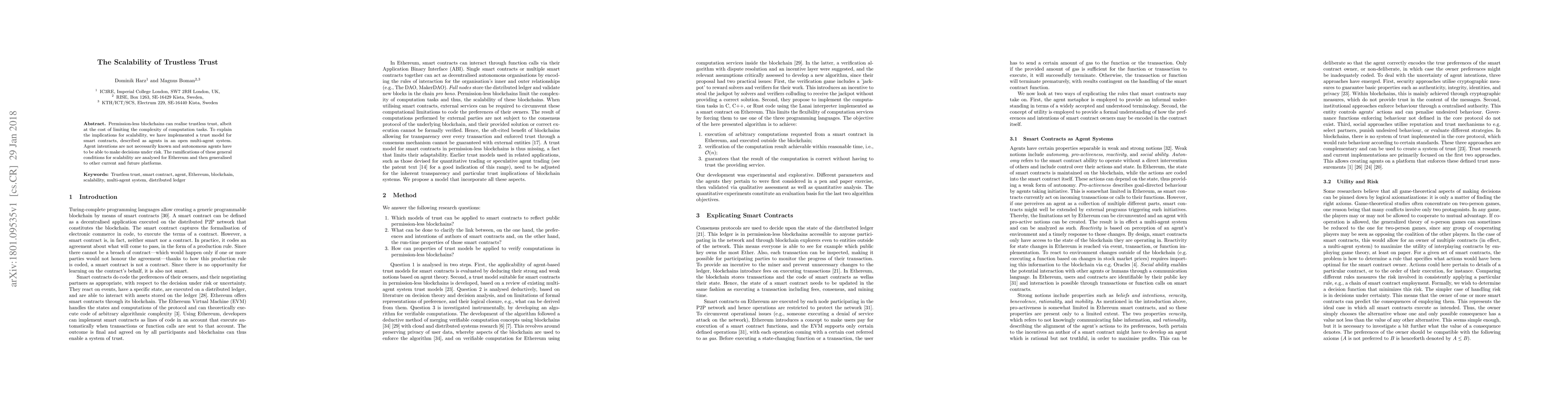 Permission-less blockchains can realise trustless trust, albeit at the cost of limiting the complexity of computation tasks. To explain the implications for scalability, we have implemented a trust model for smart contracts, described as agents in an open multi-agent system. Agent intentions are not necessarily known and autonomous agents have to be able to make decisions under risk. The ramifications of these general conditions for scalability are analysed for Ethereum and then generalised to other current and future platforms.