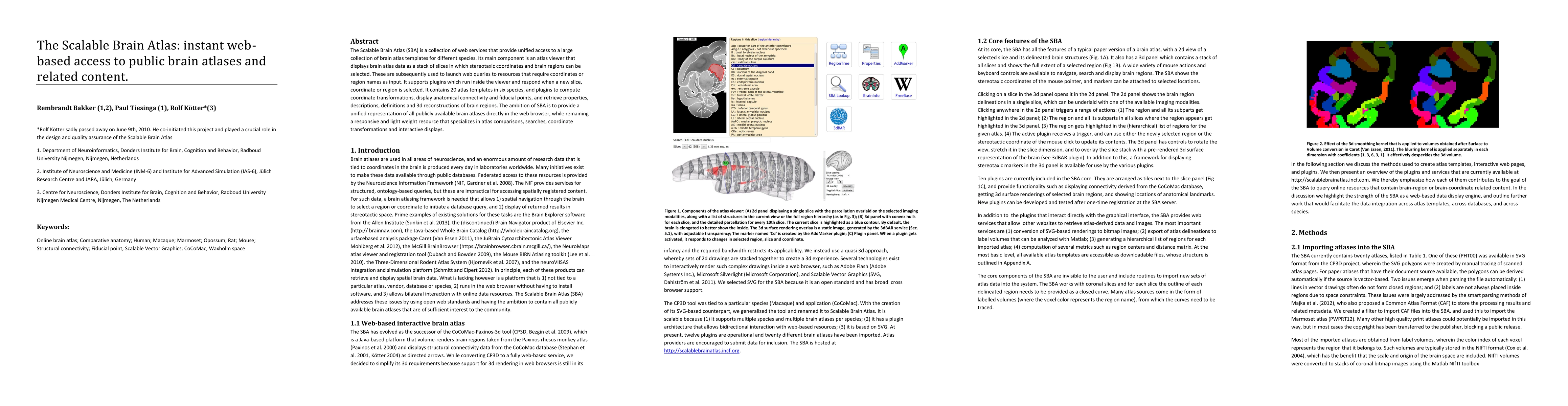 The Scalable Brain Atlas (SBA) is a web-based tool that provides unified access to a large collection of brain atlas templates across different species. It features an interactive atlas viewer, plugins for various functionalities, and web services for data queries.