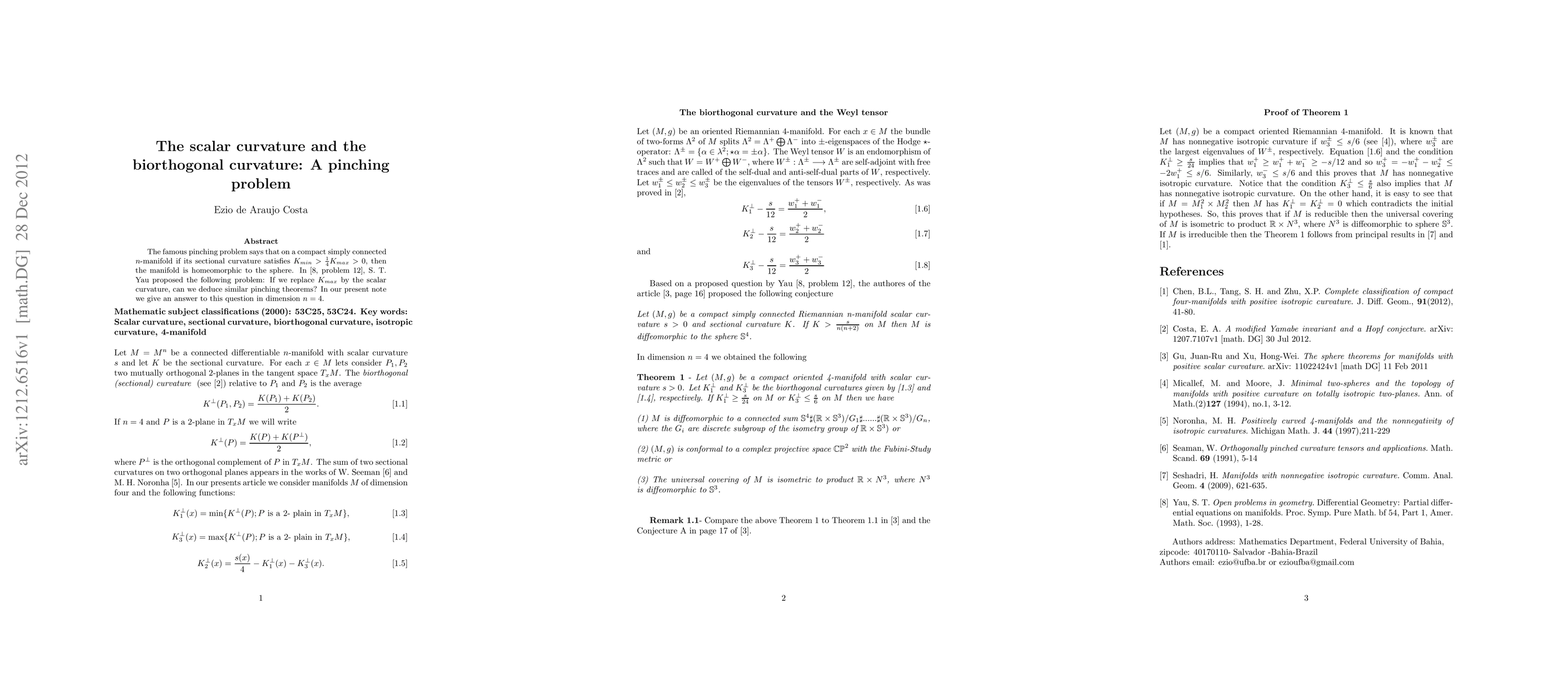 The famous pinching problem says that on a compact simply connected $n$-manifold if its sectional curvature satisfies $K_{min} > (1/4)K_{max} > 0$, then the manifold is homeomorphic to the sphere. In [8, problem 12], S. T. Yau proposed the following problem: If we replace $K_{max}$ by the scalar curvature, can we deduce similar pinching theorems? In our present note we give an answer to this question in dimension $n = 4.$}