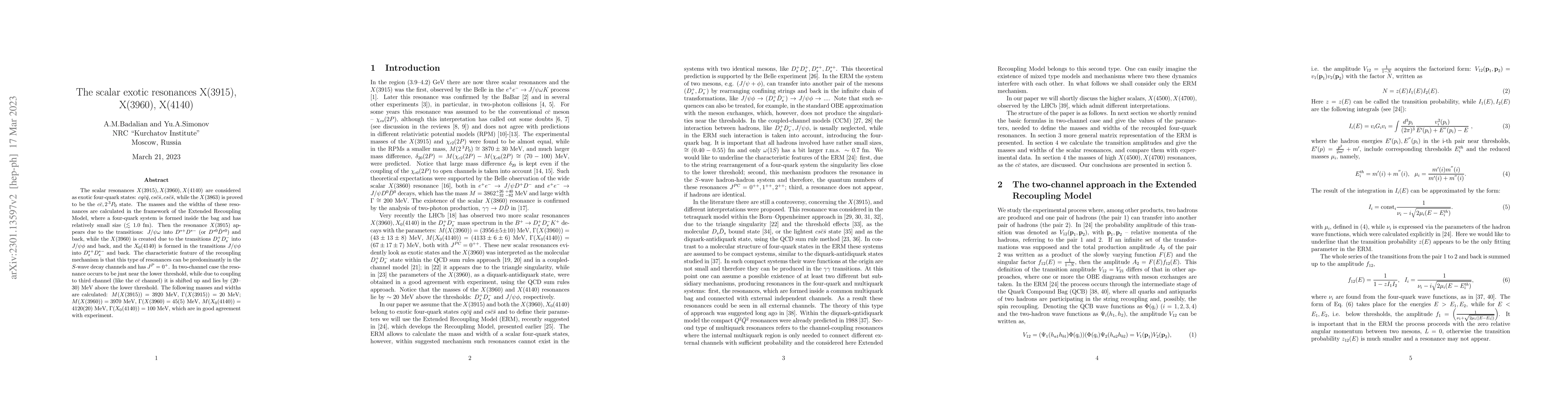 This paper investigates the scalar exotic resonances $X(3915)$, $X(3960)$, and $X(4140)$ as four-quark states within the Extended Recoupling Model, calculating their masses and widths. The model predicts $X(3915)$ near $J/\psi\omega$ thresholds, $X(3960)$ near $D_s^+D_s^-$ thresholds, and $X(4140)$ near $J/\psi\phi$ thresholds, with calculated masses and widths matching experimental data.