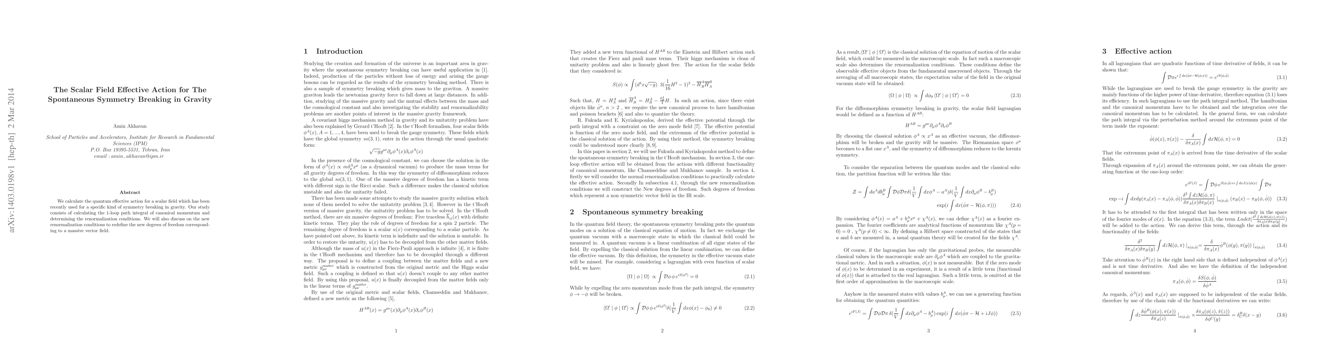 This research calculates the quantum effective action for a scalar field used in a unique gravity symmetry breaking scenario. It details 1-loop path integral computation and renormalization condition determination, also proposing new conditions for redefining massive vector field degrees of freedom.