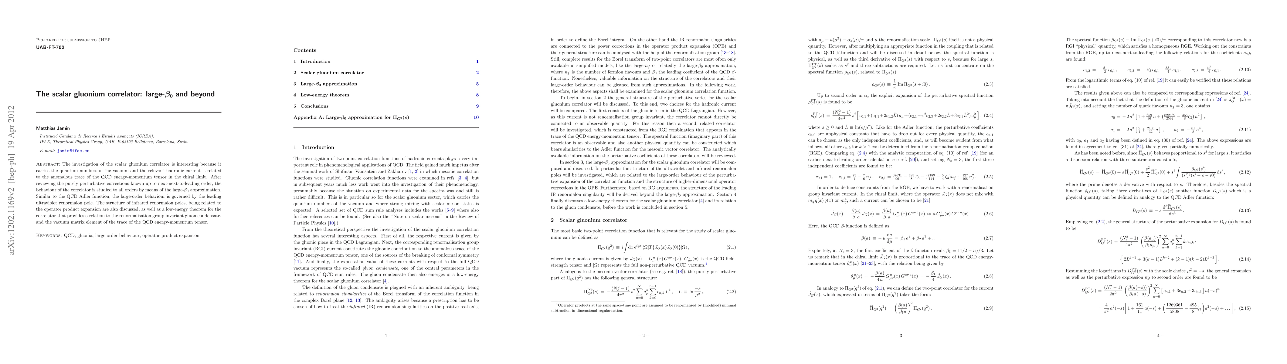 Researchers studied the scalar gluonium correlator using the large-beta_0 approximation, finding it governed by a leading ultraviolet renormalon pole similar to the QCD Adler function, with implications for understanding the vacuum matrix element of the trace of the energy-momentum tensor.
