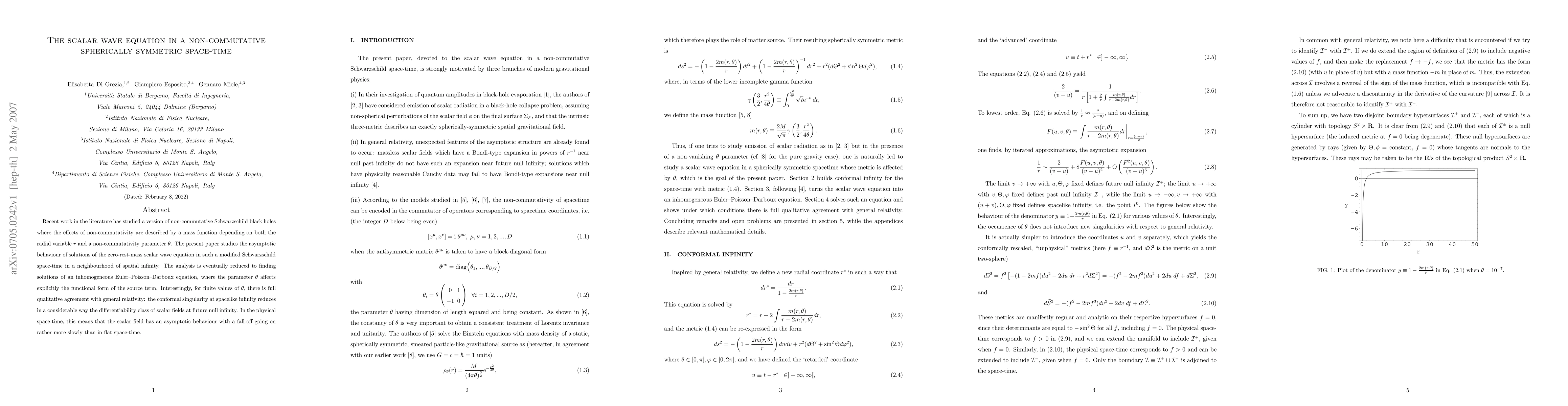 Recent work in the literature has studied a version of non-commutative Schwarzschild black holes where the effects of non-commutativity are described by a mass function depending on both the radial variable r and a non-commutativity parameter theta. The present paper studies the asymptotic behaviour of solutions of the zero-rest-mass scalar wave equation in such a modified Schwarzschild space-time in a neighbourhood of spatial infinity. The analysis is eventually reduced to finding solutions of an inhomogeneous Euler--Poisson--Darboux equation, where the parameter theta affects explicitly the functional form of the source term. Interestingly, for finite values of theta, there is full qualitative agreement with general relativity: the conformal singularity at spacelike infinity reduces in a considerable way the differentiability class of scalar fields at future null infinity. In the physical space-time, this means that the scalar field has an asymptotic behaviour with a fall-off going on rather more slowly than in flat space-time.