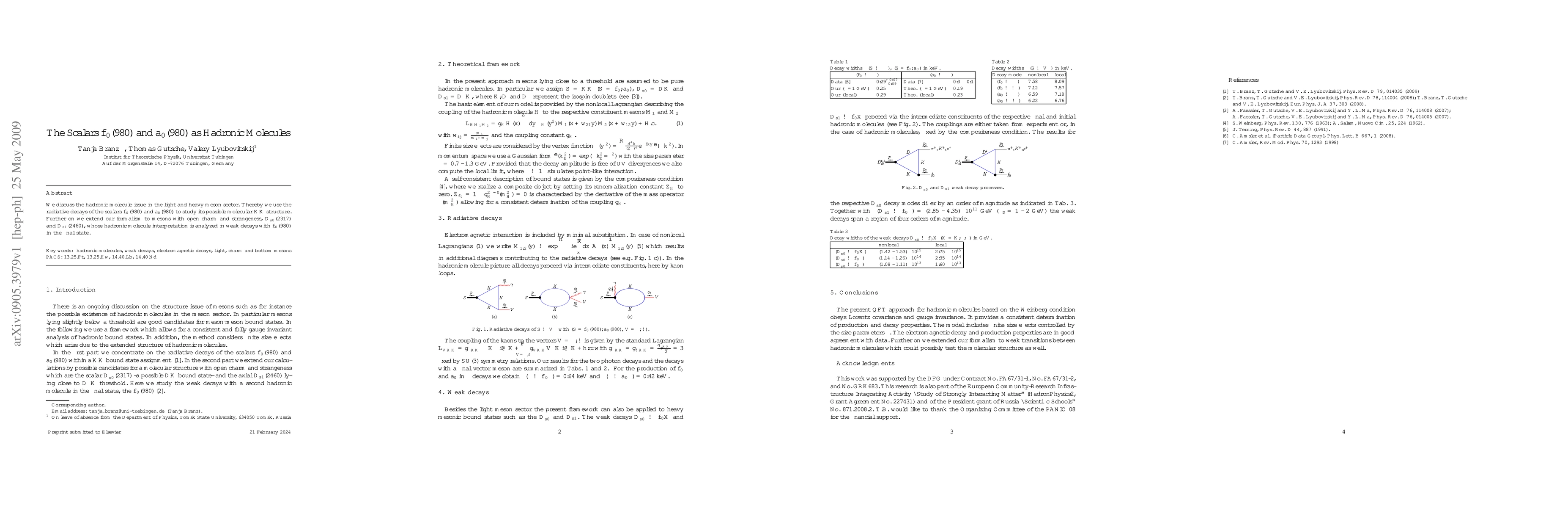 This paper investigates the potential hadronic molecule nature of the scalars f0(980) and a0(980) through their radiative decays, suggesting a K-barK structure. It also extends this analysis to charmed mesons Ds0*(2317) and Ds1(2460) in weak decays involving f0(980).