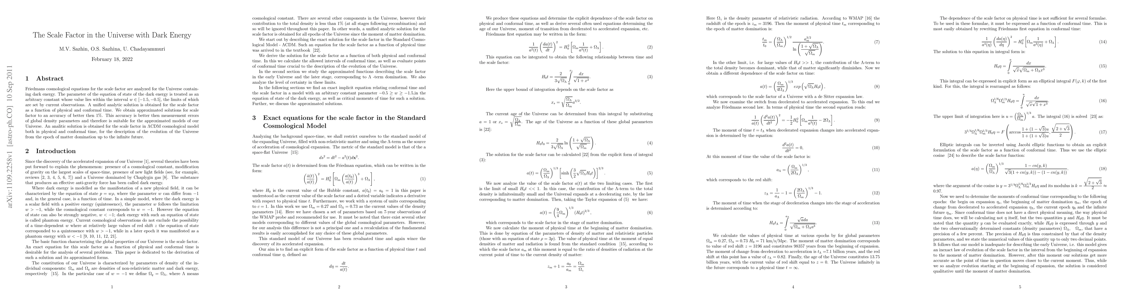 Friedmans cosmological equations for the scale factor are analyzed for the Universe containing dark energy. The parameter of the equation of state of the dark energy is treated as an arbitrary constant whose value lies within the interval $w \in [-1.5, -0.5]$, the limits of which are set by current observations. A unified analytic solution is obtained for the scale factor as a function of physical and conformal time. We obtain approximated solutions for scale factor to an accuracy of better then 1%. This accuracy is better then measurement errors of global density parameters and therefore is suitable for the approximated models of our Universe. An analytic solution is obtained for the scale factor in $\Lambda$CDM cosmological model both in physical and conformal time, for the description of the evolution of the Universe from the epoch of matter domination up to the infinite future.