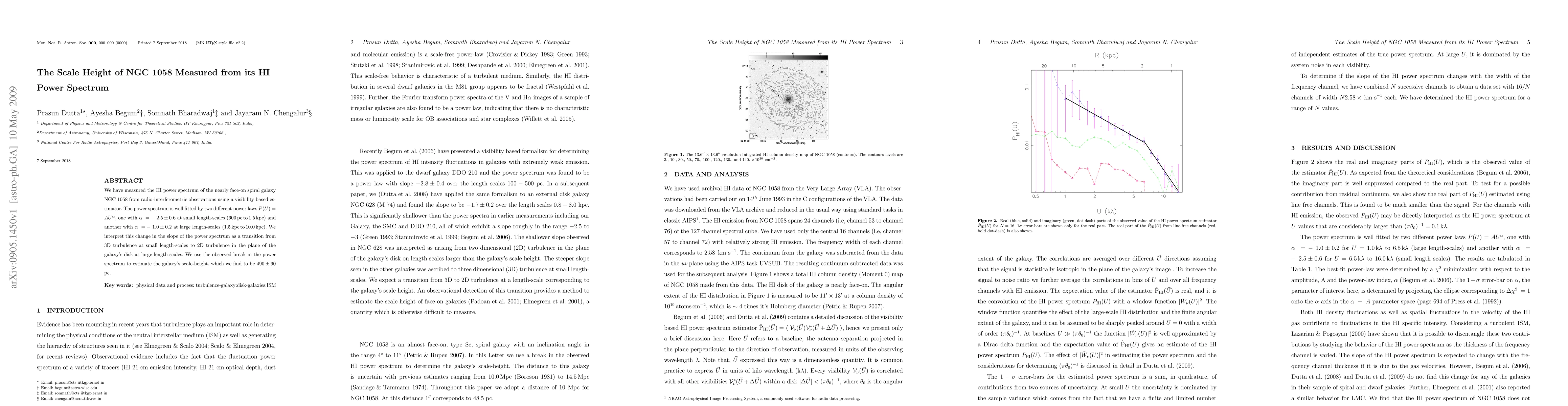 We have measured the HI power spectrum of the nearly face-on spiral galaxy NGC 1058 from radio-interferometric observations using a visibility based estimator. The power spectrum is well fitted by two different power laws $P(U)=AU^{\alpha}$, one with $\alpha =- 2.5\pm 0.6$ at small length-scales $(600 {\rm pc} {\rm to} 1.5 {\rm kpc})$ and another with $\alpha =- 1.0\pm 0.2$ at large length-scales $(1.5 {\rm kpc} {\rm to} 10.0 {\rm kpc})$. We interpret this change in the slope of the power spectrum as a transition from 3D turbulence at small length-scales to 2D turbulence in the plane of the galaxy's disk at large length-scales. We use the observed break in the power spectrum to estimate the galaxy's scale-height, which we find to be $ 490 \pm 90 $ pc.