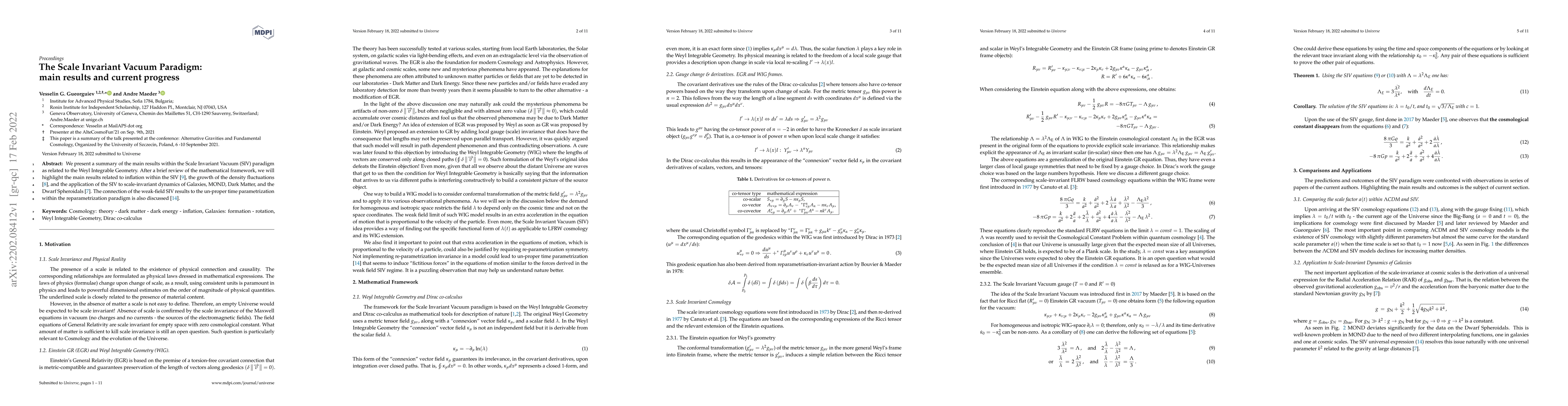 We present a summary of the main results within the Scale Invariant Vacuum (SIV) paradigm as related to the Weyl Integrable Geometry. After a brief review of the mathematical framework, we will highlight the main results related to inflation within the SIV [9], the growth of the density fluctuations [8], and the application of the SIV to scale-invariant dynamics of Galaxies, MOND, Dark Matter, and the Dwarf Spheroidals [7]. The connection of the weak-field SIV results to the un-proper time parametrization within the re-parametrization paradigm is also discussed [14].