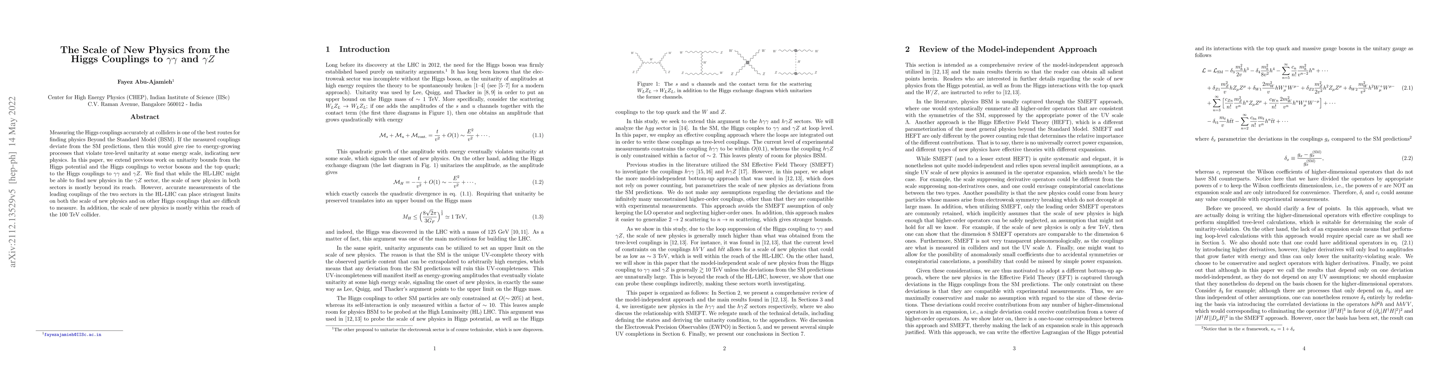 This paper investigates the potential for discovering new physics beyond the Standard Model through precise measurements of the Higgs boson's couplings to $\gamma\gamma$ and $\gamma Z$ at colliders. While the High-Luminosity Large Hadron Collider (HL-LHC) may detect new physics in the $\gamma Z$ sector, the overall scale of new physics remains largely out of its reach, but is within the capability of a future $100$ TeV collider.