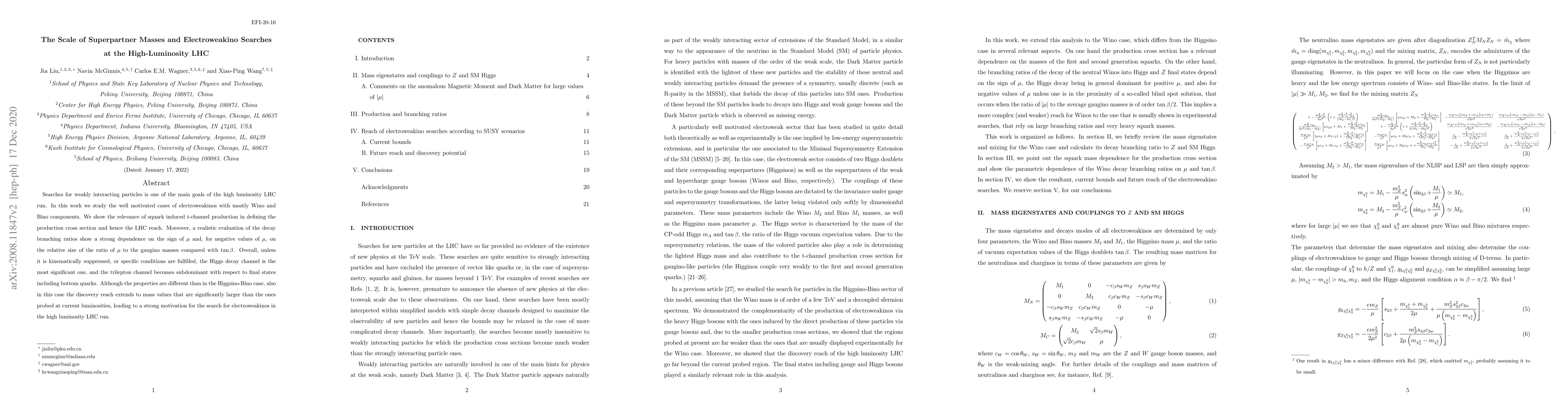 Searches for weakly interacting particles is one of the main goals of the high luminosity LHC run. In this work we study the well motivated cases of electroweakinos with mostly Wino and Bino components. We show the relevance of squark induced t-channel production in defining the production cross section and hence the LHC reach. Moreover, a realistic evaluation of the decay branching ratios show a strong dependence on the sign of $\mu$ and, for negative values of $\mu$, on the relative size of the ratio of $\mu$ to the gaugino masses compared with tan$\beta$. Overall, unless it is kinematically suppressed, or specific conditions are fulfilled, the Higgs decay channel is the most significant one, and the trilepton channel becomes subdominant with respect to final states including bottom quarks. Although the properties are different than in the Higgsino-Bino case, also in this case the discovery reach extends to mass values that are significantly larger than the ones probed at current luminosities, leading to a strong motivation for the search for electroweakinos in the high luminosity LHC run.