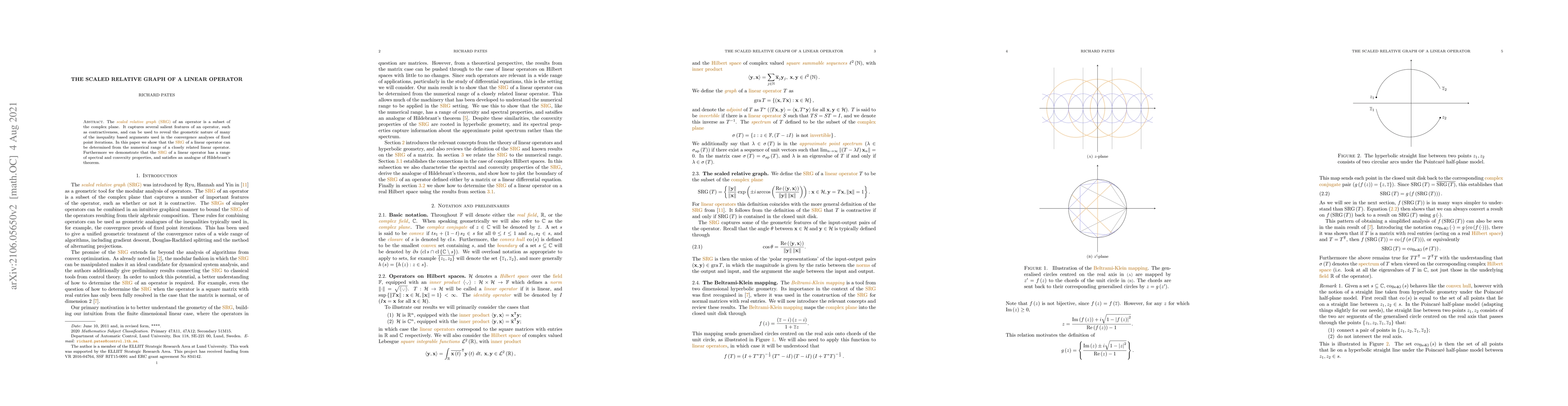 The scaled relative graph (SRG) of an operator is a subset of the complex plane. It captures several salient features of an operator, such as contractiveness, and can be used to reveal the geometric nature of many of the inequality based arguments used in the convergence analyses of fixed point iterations. In this paper we show that the SRG of a linear operator can be determined from the numerical range of a closely related linear operator. Furthermore we demonstrate that the SRG of a linear operator has a range of spectral and convexity properties, and satisfies an analogue of Hildebrant's theorem.