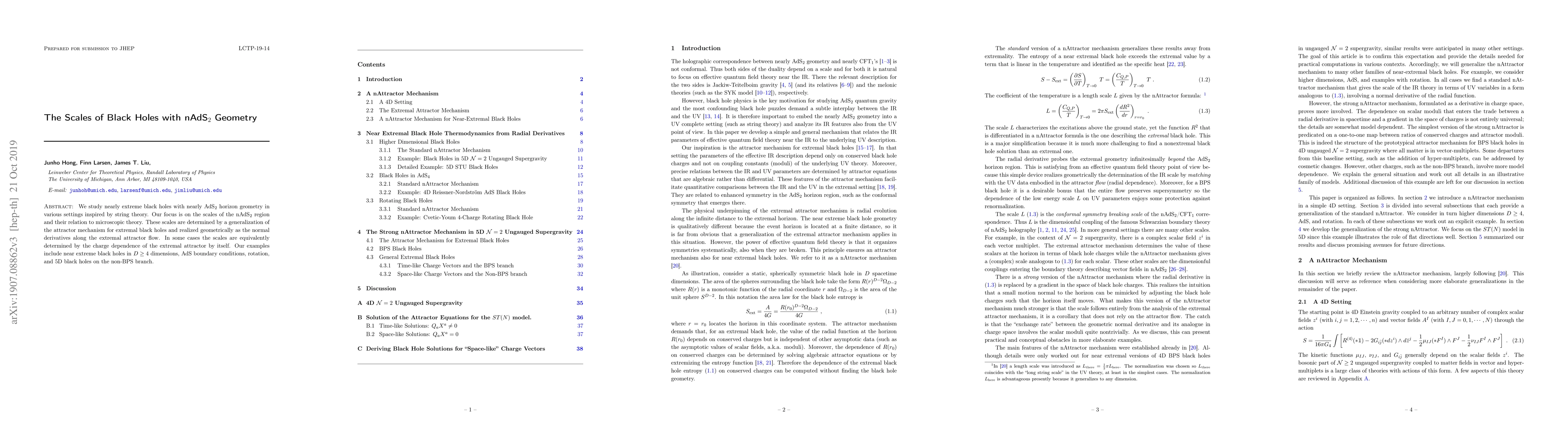 This research explores nearly extreme black holes with nearly AdS$_2$ horizon geometry, generalizing the attractor mechanism for extremal black holes. The study examines these scales in various string theory-inspired settings, including dimensions, boundary conditions, rotation, and non-BPS 5D black holes, linking microscopic theory with geometric realizations.