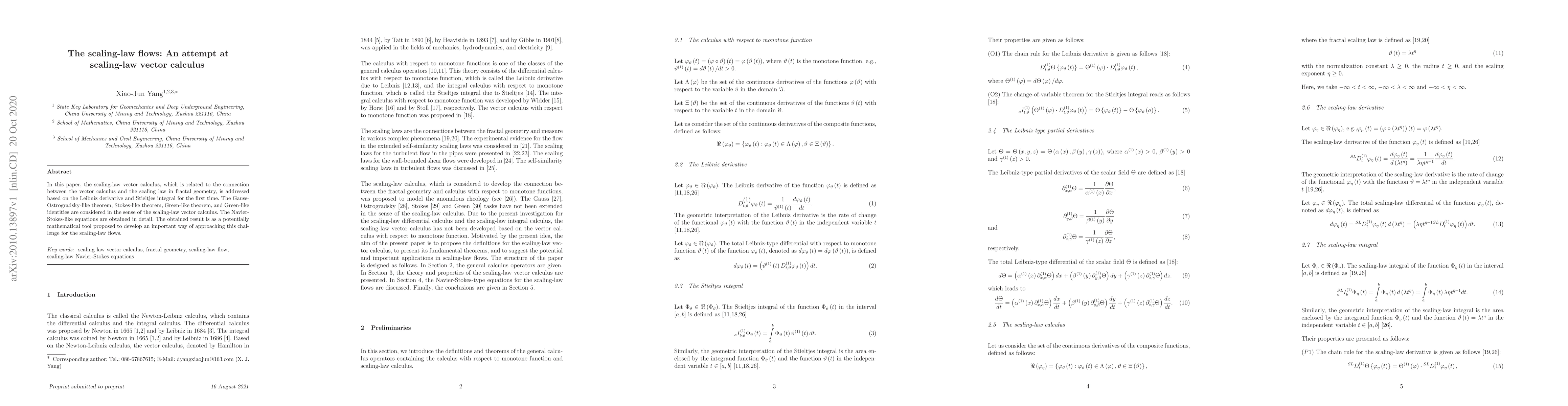 In this paper, the scaling-law vector calculus, which is related to the connection between the vector calculus and the scaling law in fractal geometry, is addressed based on the Leibniz derivative and Stieltjes integral for the first time. The Gauss-Ostrogradsky-like theorem, Stokes-like theorem, Green-like theorem, and Green-like identities are considered in the sense of the scaling-law vector calculus. The Navier-Stokes-like equations are obtained in detail. The obtained result is as a potentially mathematical tool proposed to develop an important way of approaching this challenge for the scaling-law flows.