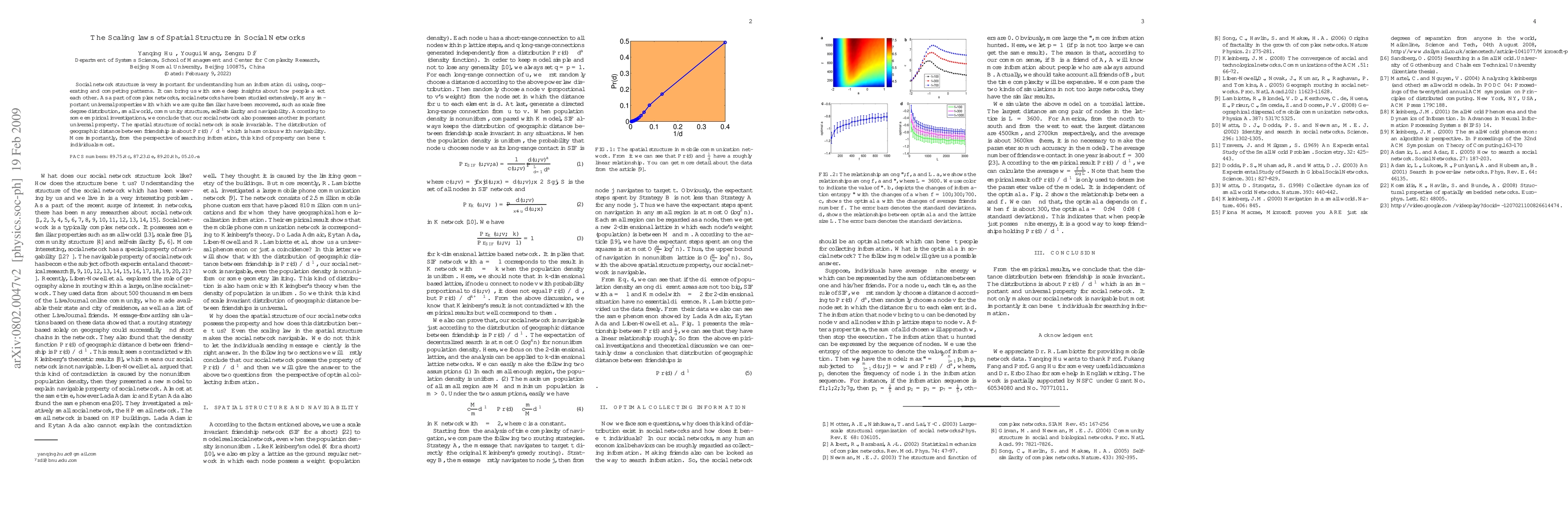 This paper investigates the spatial structure of social networks, revealing that geographic distance between friendships follows a scale-invariant distribution, $Pr(d) \propto d^{-1}$. This property enhances information search efficiency, providing deep insights into human interactions.