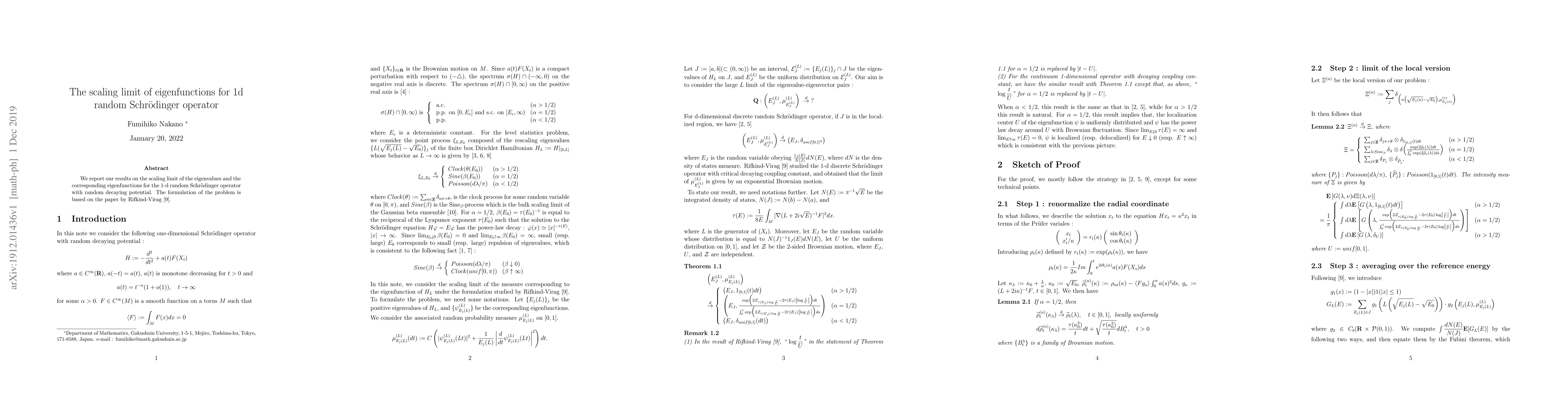 We report our results on the scaling limit of the eigenvalues and the corresponding eigenfunctions for the 1-d random Schr\"odinger operator with random decaying potential. The formulation of the problem is based on the paper by Rifkind-Virag.