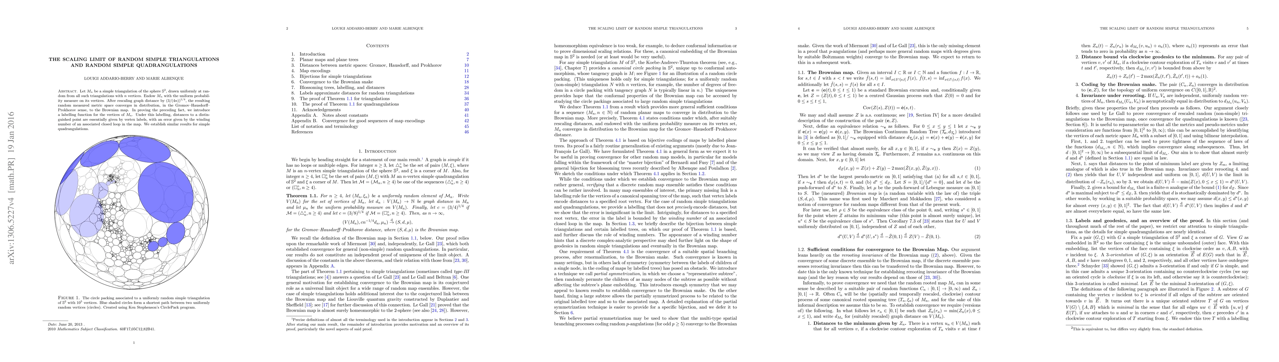 This paper investigates the scaling limit of random simple triangulations and quadrangulations of the sphere, showing that after appropriate rescaling, they converge to the Brownian map. The study introduces a labelling function that relates vertex distances to labels, with errors determined by winding numbers.