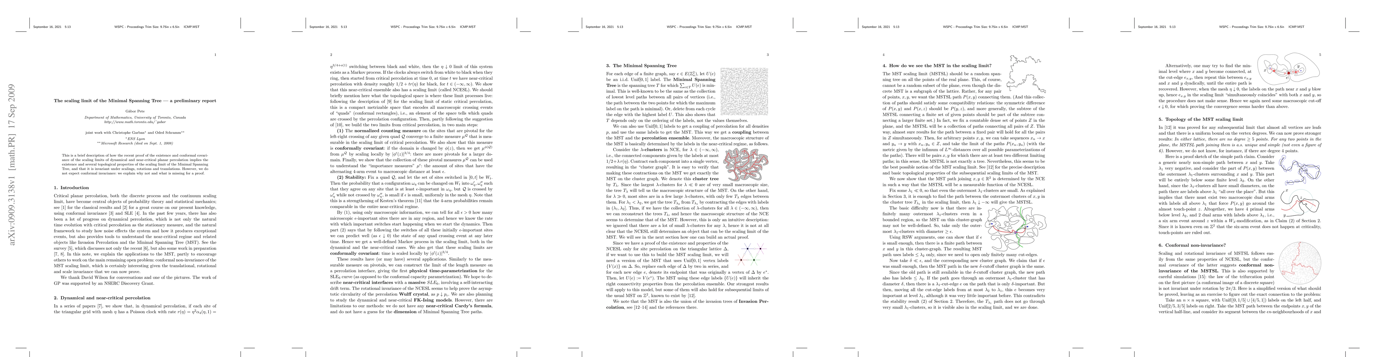 This paper reports on the existence and conformal covariance of the scaling limit of the Minimal Spanning Tree, inferred from recent results on dynamical and near-critical planar percolation. It highlights the invariance under scalings, rotations, and translations but notes the absence of expected conformal invariance and outlines the gaps in the proof.