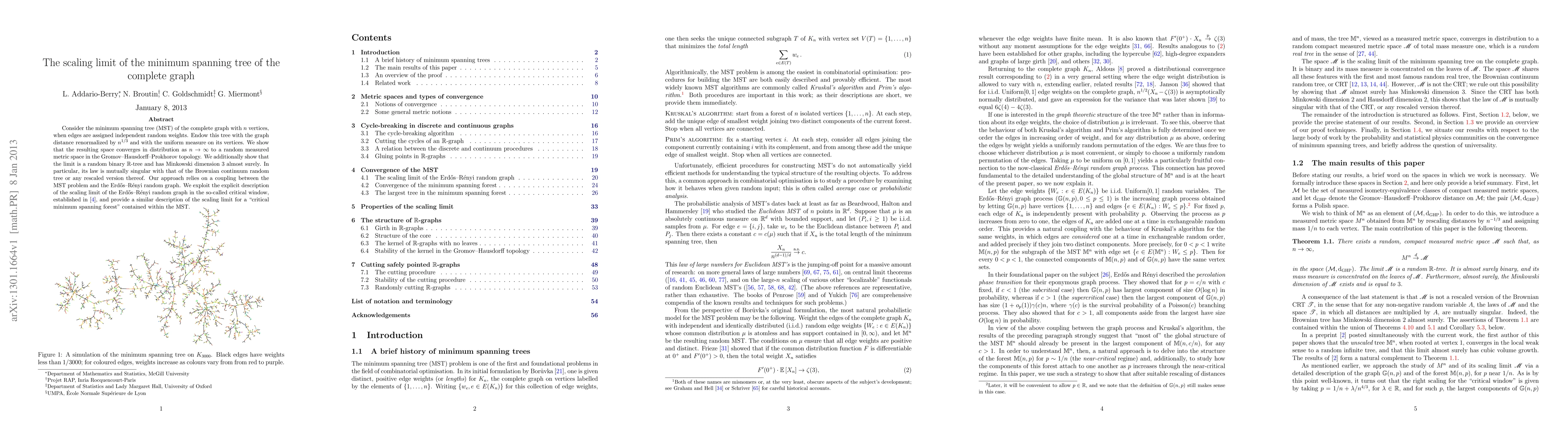 This paper studies the scaling limit of the minimum spanning tree (MST) of a complete graph with random edge weights, showing that it converges to a random binary R-tree with Minkowski dimension 3, distinct from the Brownian continuum random tree. The analysis uses a coupling technique with the Erdős-Rényi random graph to derive this result.