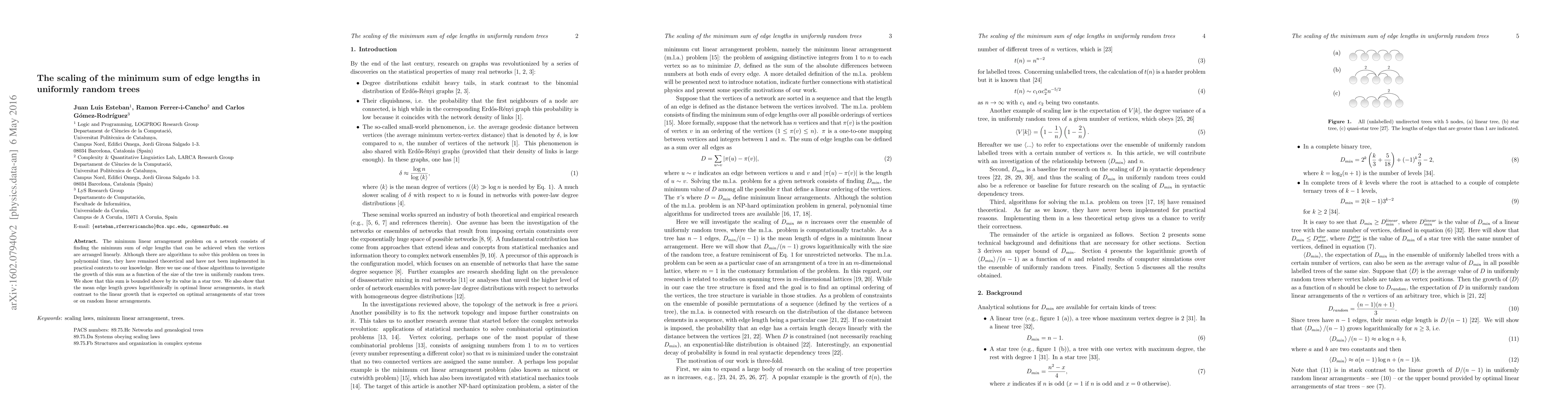 The minimum sum of edge lengths in uniformly random trees grows logarithmically with tree size, contradicting expected linear growth for optimal arrangements.