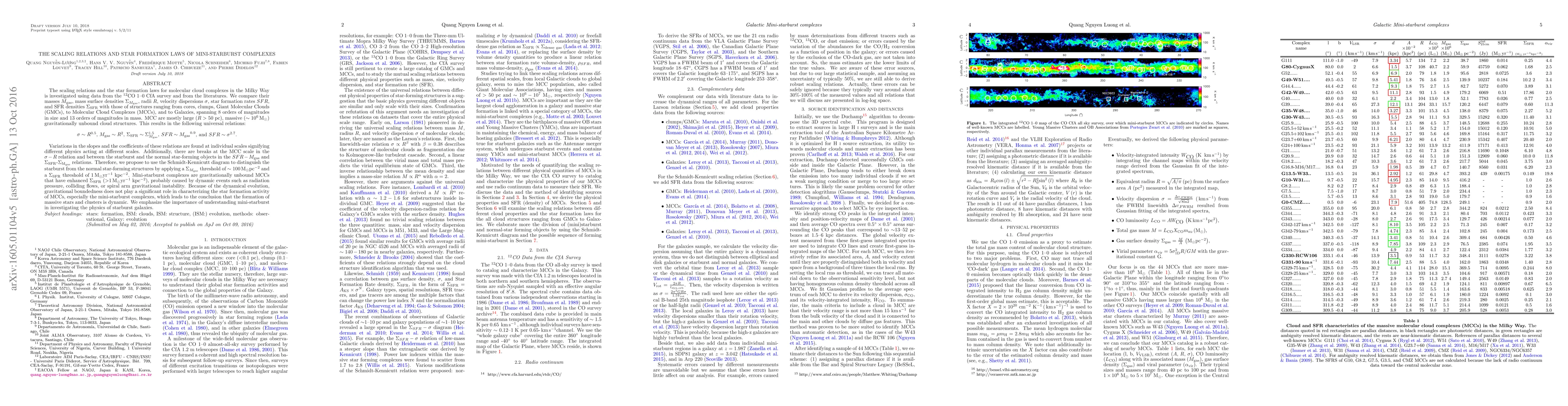The scaling relations and the star formation laws for molecular cloud complexes in the Milky Way is investigated. We compare their masses $M_{\rm gas}$, mass surface densities $\Sigma_{M_{\rm gas}}$, radii $R$, velocity dispersions $\sigma$, star formation rates $SFR$, and SFR densities $\Sigma_{\rm SFR}$ with those of structures ranging from cores, clumps, Giant Molecular Clouds (GMCs), to Molecular Cloud Complexes (MCCs), and to Galaxies, spanning 8 orders of magnitudes in size and 13 orders of magnitudes in mass. MCC are mostly large ($R>50$ pc), massive ($\sim 10^{6}$\,\msun) gravitationally unbound cloud structures. This results in the following universal relations: $\sigma\sim R^{0.5}$, $M_{\rm gas}\sim R^{2}$, $\Sigma_{\rm SFR}\sim \Sigma_{M_{\rm gas}}^{1.5}$, ${SFR}\sim {M_{\rm gas}}^{0.9}$, and ${SFR}\sim {\sigma}^{2.7}$. Variations in the slopes and the coefficients of these relations are found at individual scales signifying different physics acting at different scales. Additionally, there are breaks at the MCC scale in the $\sigma-R$ relation and between the starburst and the normal star-forming objects in the $SFR-M_{\rm gas}$ and $\Sigma_{\rm SFR}$-$\Sigma_{\rm M_{\rm gas}}$ relations. We propose to use the Schmidt-Kennicutt diagram to distinguish the starburst from the normal star-forming structures by applying a $\Sigma_{M_{\rm gas}}$ threshold of $\sim100$\,\msun pc$^{-2}$ and a $\Sigma_{\rm SFR}$ threshold of 1\,\msun yr$^{-1}$ kpc$^{-2}$. Mini-starburst complexes have enhanced $\Sigma_{\rm SFR}$ ($>$1\,\msun yr$^{-1}$ kpc$^{-2}$), probably caused by dynamic events such as radiation pressure, colliding flows, or spiral arm gravitational instability. Because of the dynamical evolution, gravitational boundedness does not play a significant role in characterizing the star formation activity of MCCs, especially the mini-starburst complexes.