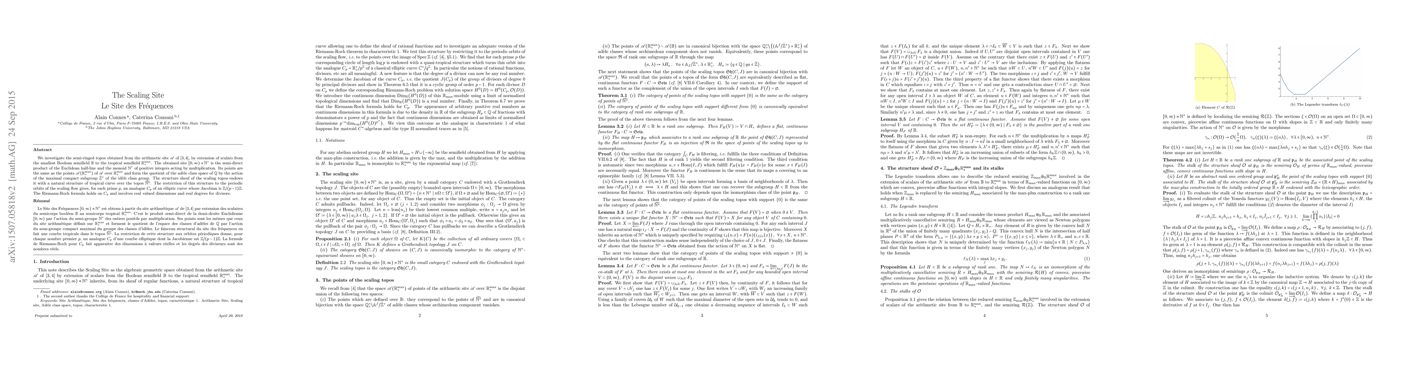 We investigate the semi-ringed topos obtained by extension of scalars from the arithmetic site of our previous work, by replacing the smallest Boolean semifield by the tropical semifield of real numbers with the max-plus operations. The obtained site is the semi-direct product of the Euclidean half-line by the action of the monoid of positive integers by multiplication. Its points are the same as the points of the arithmetic site over the tropical semifield of real numbers, and coincide with the quotient of the adele class space of Q by the action of the maximal compact subgroup of the idele class group. The structure sheaf of the scaling topos endows it with a natural structure of tropical curve over the arithmetic topos. The restriction of this structure to the periodic orbits of the scaling flow gives, for each prime p, an analogue of an elliptic curve whose Jacobian is a cyclic group of order p-1. The Riemann-Roch formula holds and involves real valued dimensions and real degrees for divisors.