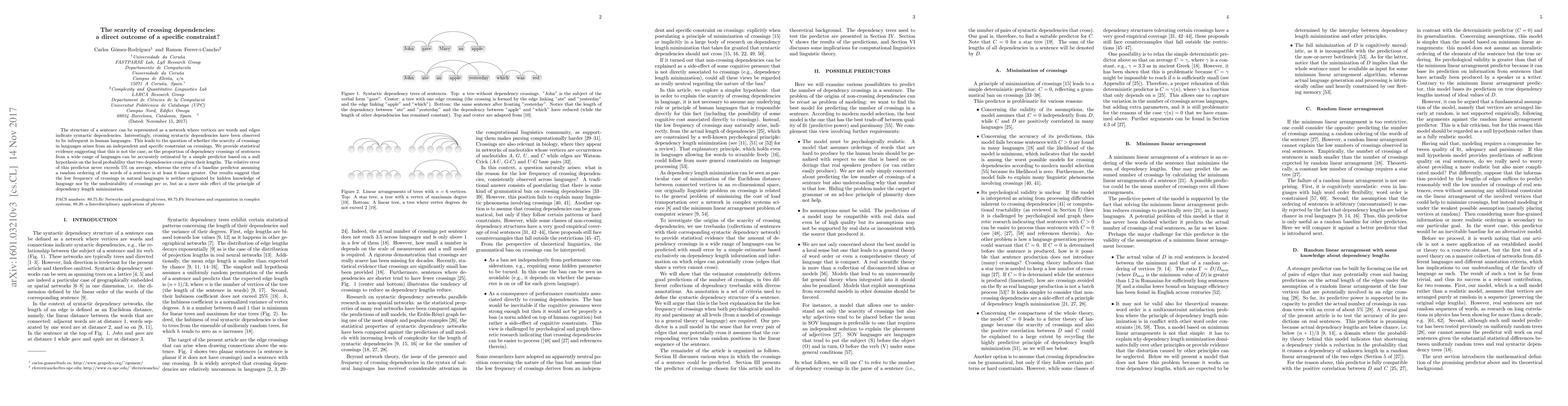 A study found that the scarcity of crossing syntactic dependencies in human languages cannot be attributed to specific constraints on crossings, but rather to the principle of dependency length minimization.