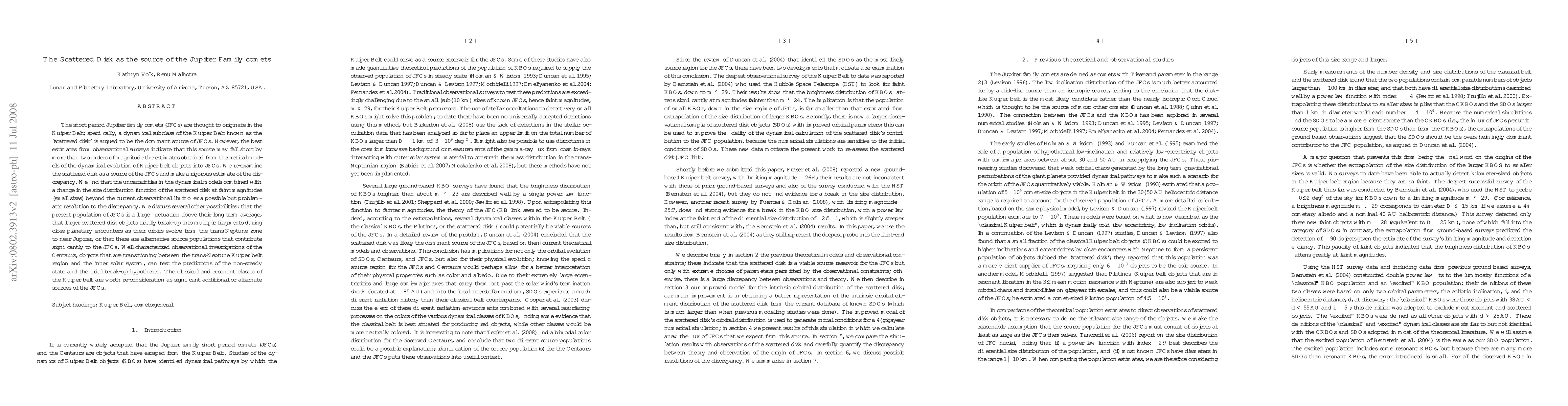 This paper investigates the scattered disk as the primary source for Jupiter Family Comets (JFCs), finding a significant discrepancy between observational and theoretical estimates. It explores various resolutions, including dynamical model uncertainties and changes in the size distribution of scattered disk objects, and suggests further observational studies of Centaurs and re-evaluation of the Kuiper Belt's classical and resonant classes as potential alternative sources.