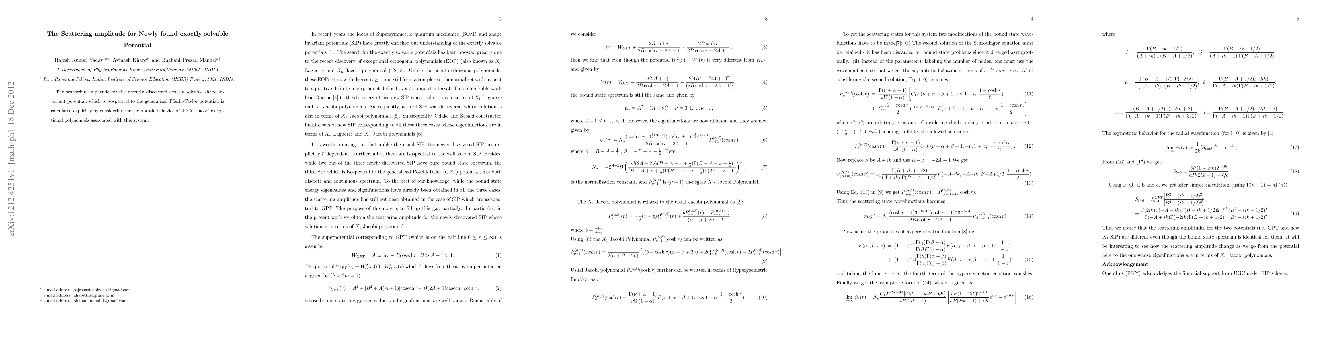 This research paper calculates the scattering amplitude for a newly discovered, exactly solvable potential, which is similar to the generalized P"oschl-Taylor potential. The calculation is done by examining the asymptotic behavior of specific Jacobi exceptional polynomials linked to this system.