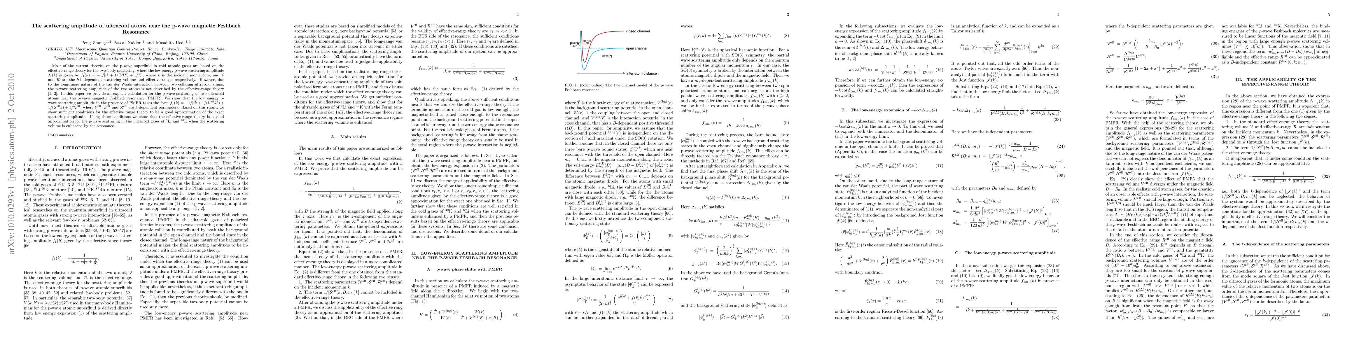 This paper calculates the p-wave scattering amplitude for ultracold atoms near the p-wave magnetic Feshbach resonance, showing that it deviates from the effective-range theory. It provides a new form for the scattering amplitude and demonstrates that the effective-range theory is a good approximation for certain conditions in ultracold gases of $^{6}$Li and $^{40}$K.