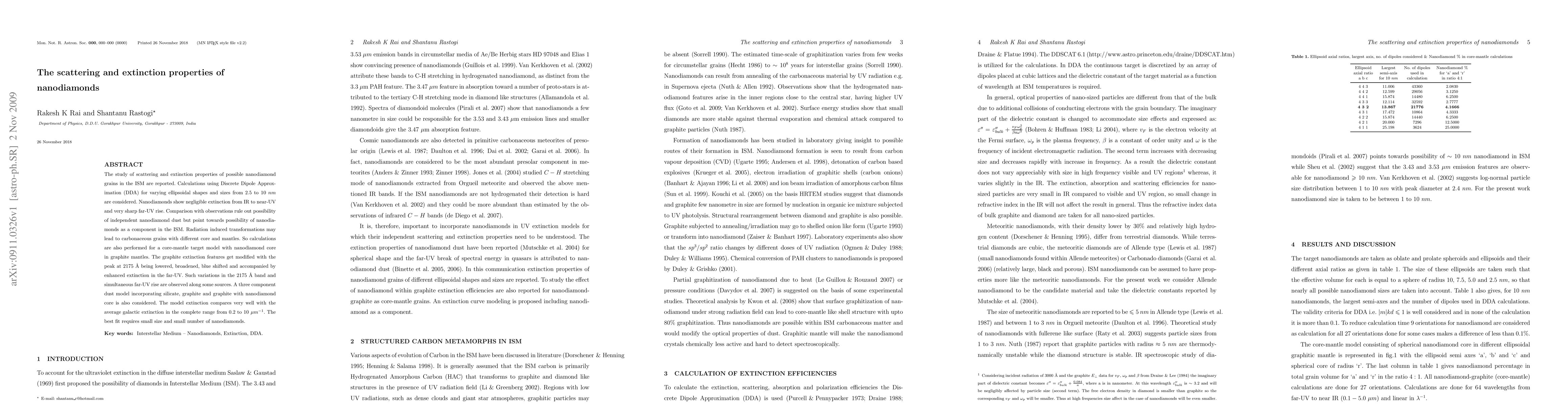 This paper investigates the scattering and extinction properties of nanodiamond grains in the interstellar medium (ISM) using Discrete Dipole Approximation, finding negligible extinction in the IR to near-UV and a sharp rise in the far-UV. It suggests nanodiamonds likely contribute to ISM dust, with radiation-induced transformations altering the 2175 Å extinction feature.