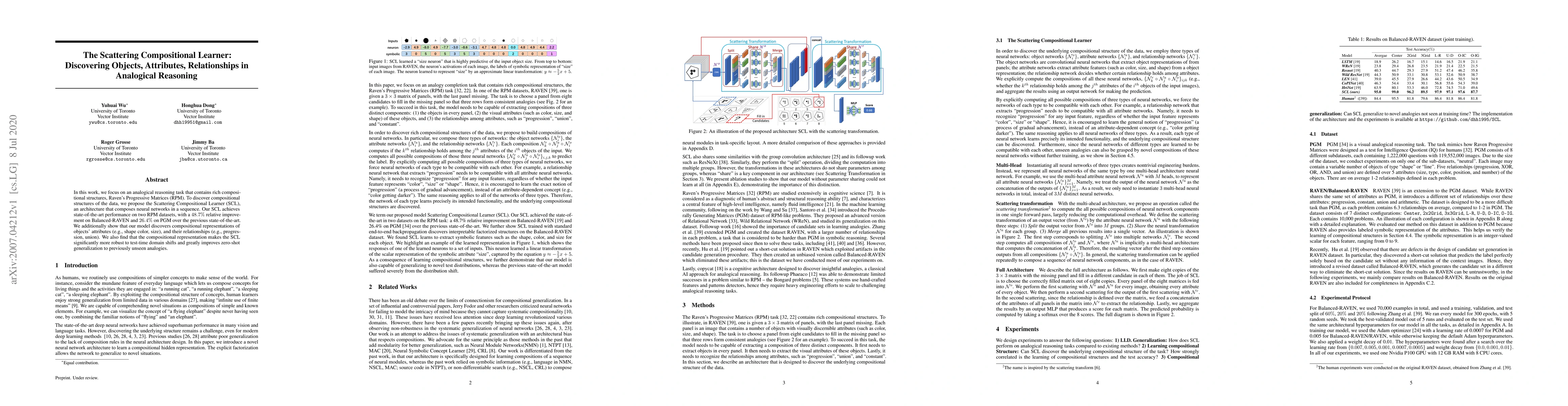 In this work, we focus on an analogical reasoning task that contains rich compositional structures, Raven's Progressive Matrices (RPM). To discover compositional structures of the data, we propose the Scattering Compositional Learner (SCL), an architecture that composes neural networks in a sequence. Our SCL achieves state-of-the-art performance on two RPM datasets, with a 48.7% relative improvement on Balanced-RAVEN and 26.4% on PGM over the previous state-of-the-art. We additionally show that our model discovers compositional representations of objects' attributes (e.g., shape color, size), and their relationships (e.g., progression, union). We also find that the compositional representation makes the SCL significantly more robust to test-time domain shifts and greatly improves zero-shot generalization to previously unseen analogies.