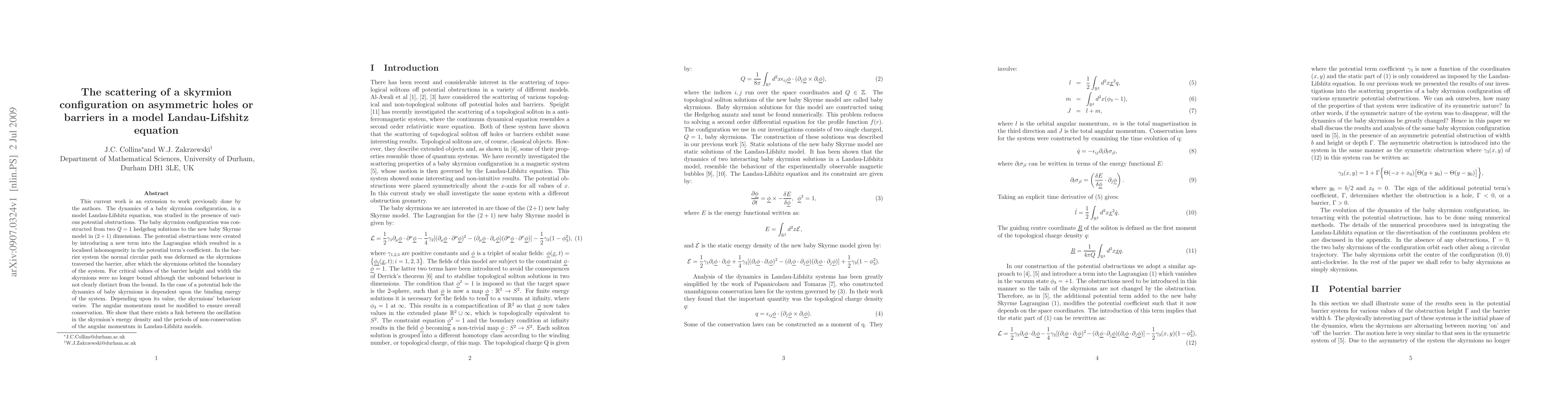 This current work is an extension to work previously done by the authors. The dynamics of a baby skyrmion configuration, in a model Landau-Lifshitz equation, was studied in the presence of various potential obstructions. The baby skyrmion configuration was constructed from two Q=1 hedgehog solutions to the new baby Skyrme model in $(2+1)$ dimensions. The potential obstructions were created by introducing a new term into the Lagrangian which resulted in a localised inhomogeneity in the potential term's coefficient. In the barrier system the normal circular path was deformed as the skyrmions traversed the barrier, after which the skyrmions orbited the boundary of the system. For critical values of the barrier height and width the skyrmions were no longer bound although the unbound behaviour is not clearly distinct from the bound. In the case of a potential hole the dynamics of baby skyrmions is dependent upon the binding energy of the system. Depending upon its value, the skyrmions' behaviour varies. The angular momentum must be modified to ensure overall conservation. We show that there exists a link between the oscillation in the skyrmion's energy density and the periods of non-conservation of the angular momentum in Landau-Lifshitz models.