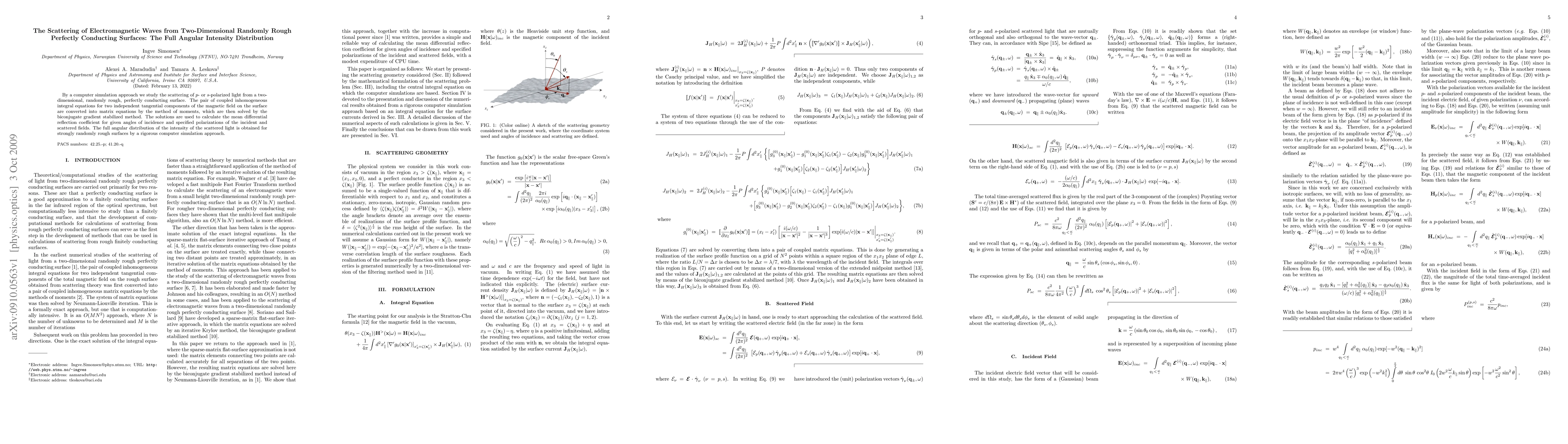 This paper investigates the scattering of $p$- or $s$-polarized electromagnetic waves from a two-dimensional, randomly rough, perfectly conducting surface using a computer simulation. The study employs the method of moments to solve coupled integral equations and derives the full angular intensity distribution of scattered light.