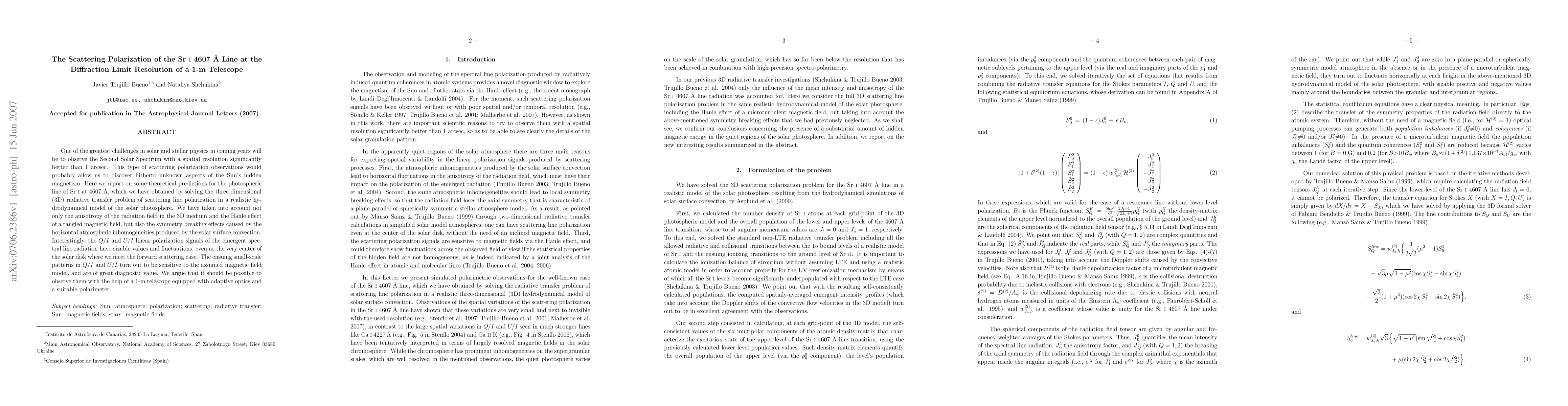One of the greatest challenges in solar and stellar physics in coming years will be to observe the Second Solar Spectrum with a spatial resolution significantly better than 1 arcsec. This type of scattering polarization observations would probably allow us to discover hitherto unknown aspects of the Sun's hidden magnetism. Here we report on some theoretical predictions for the photospheric line of Sr I at 4607 \AA, which we have obtained by solving the three-dimensional (3D) radiative transfer problem of scattering line polarization in a realistic hydrodynamical model of the solar photosphere. We have taken into account not only the anisotropy of the radiation field in the 3D medium and the Hanle effect of a tangled magnetic field, but also the symmetry breaking effects caused by the horizontal atmospheric inhomogeneities produced by the solar surface convection. Interestingly, the Q/I and U/I linear polarization signals of the emergent spectral line radiation have sizable values and fluctuations, even at the very center of the solar disk where we meet the forward scattering case. The ensuing small-scale patterns in Q/I and U/I turn out to be sensitive to the assumed magnetic field model, and are of great diagnostic value. We argue that it should be possible to observe them with the help of a 1-m telescope equipped with adaptive optics and a suitable polarimeter.